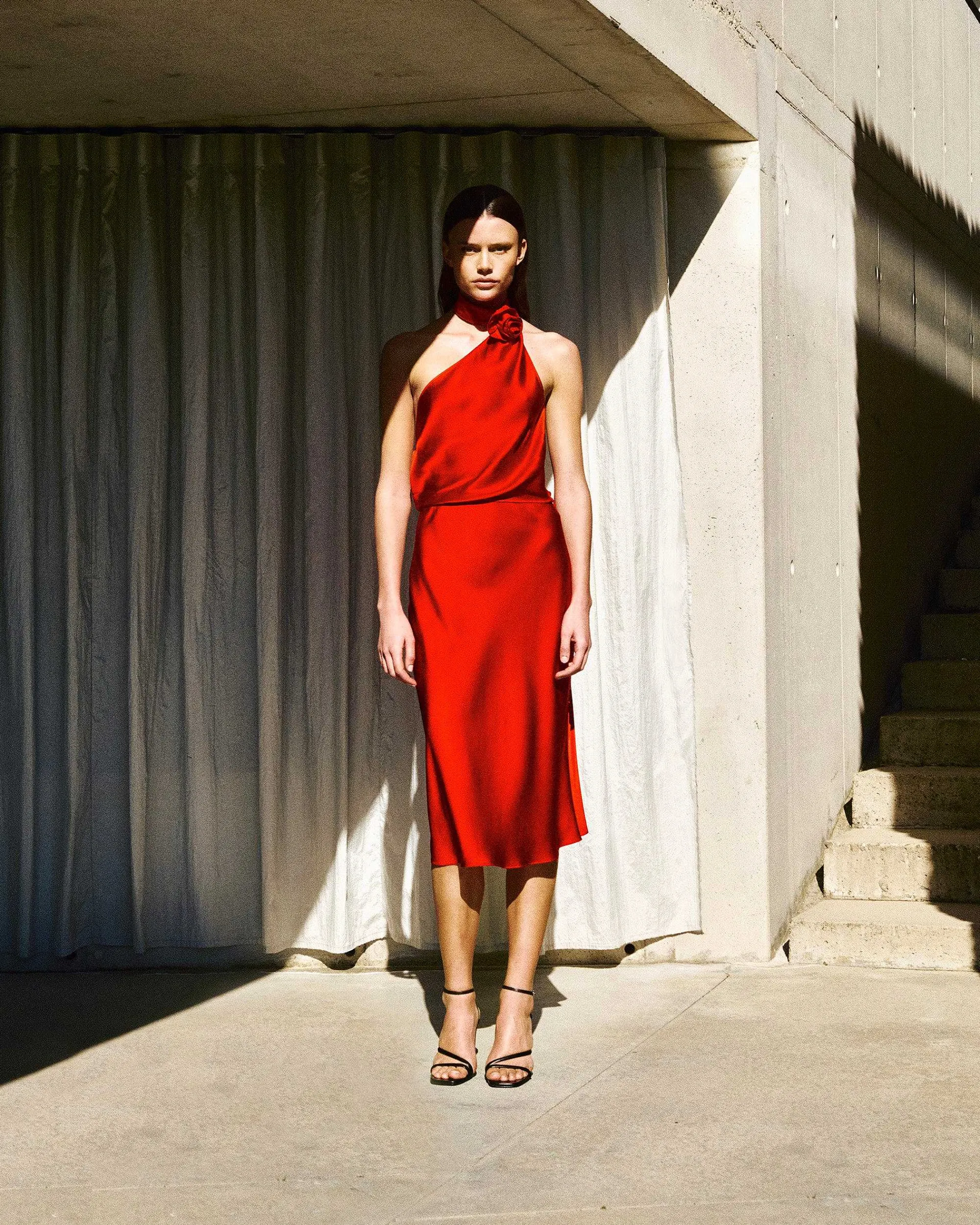 La Jupe Gina Mi-Longue En Satin De Soie Brillant Et Soyeux S’Adopte De Jour Comme De Nuit, Avec Un Caraco Léger Comme Une Maille Moelleuse. D’Une Élégance Cosmique, Elle Dévoile Une Taille Élastiquée Et Un Drapé Fluide Évasé.
