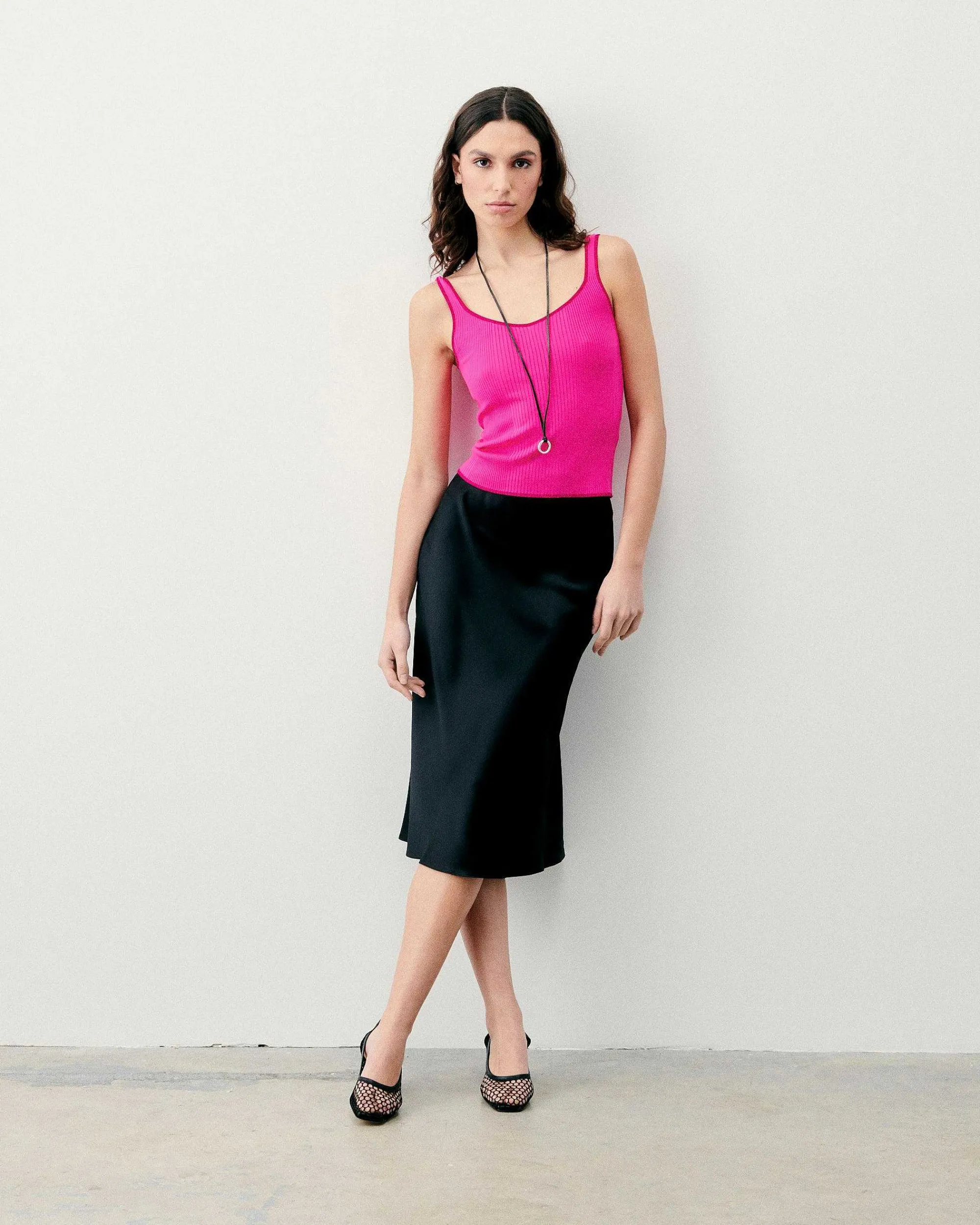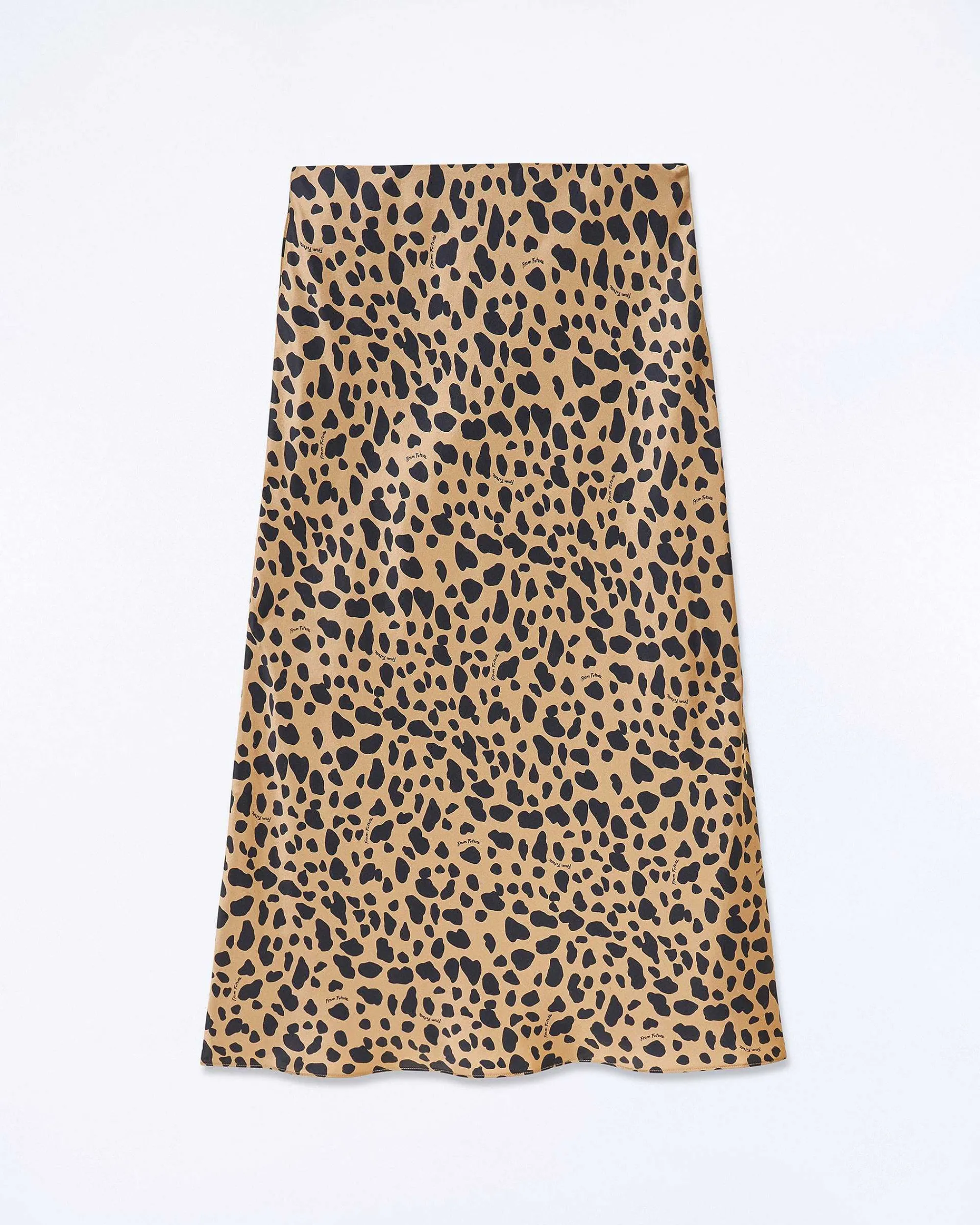Ornée D’Un Imprimé Animal, La Jupe Gina Mi-Longue En Satin De Soie Brillant Et Soyeux S’Adopte De Jour Comme De Nuit, Avec Un Caraco Léger Comme Une Maille Moelleuse. D’Une Élégance Cosmique, Elle Dévoile Une Taille Élastiquée Et Un Drapé Fluide Évasé.