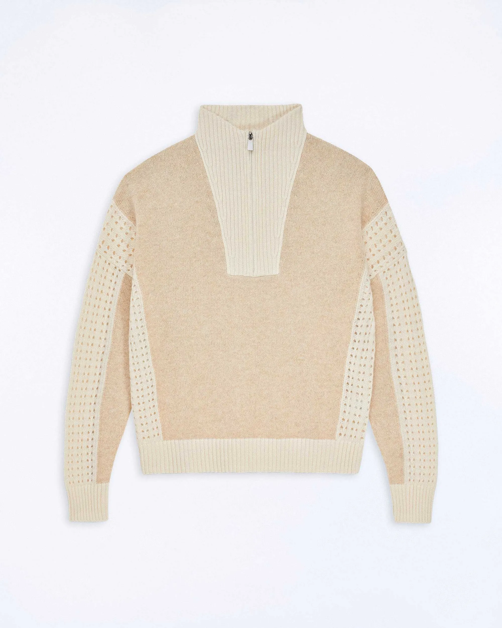Prête À Embarquer Vers Un Futur Empreint De Style Et De Douceur ? Ce Pull Confectionné En Cachemire 4 Fils Dévoile Un Col Camionneur Zippé Et Montant, Et Affiche Des Empiècements En Crochet Ajouré. Un Jeu De Contraste Audacieux Pour Propulser Vos Looks Du Quotidien.