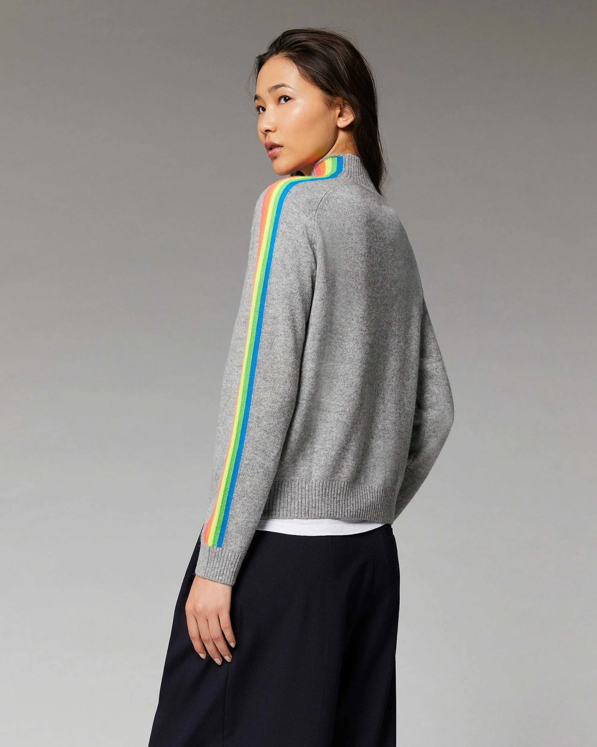 Douceur Et Légèreté Pour Ce Pull Court Confectionné En Cachemire 2 Fils Qui Capture L’Essence Du Style Futuriste. Muni D’Un Col Montant Et De Bords Côtelés, Il Se Twiste De Bandes Aux Couleurs Vibrantes Le Long Des Manches. Idéal Pour Structurer La Silhouette Avec Audace, Mixez-Le À Un Jean Casual Ou Une Jupe Fluide.