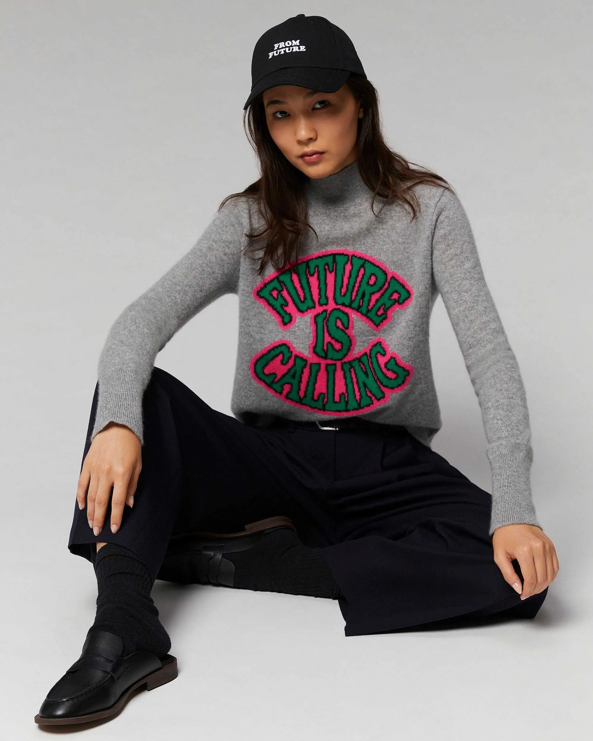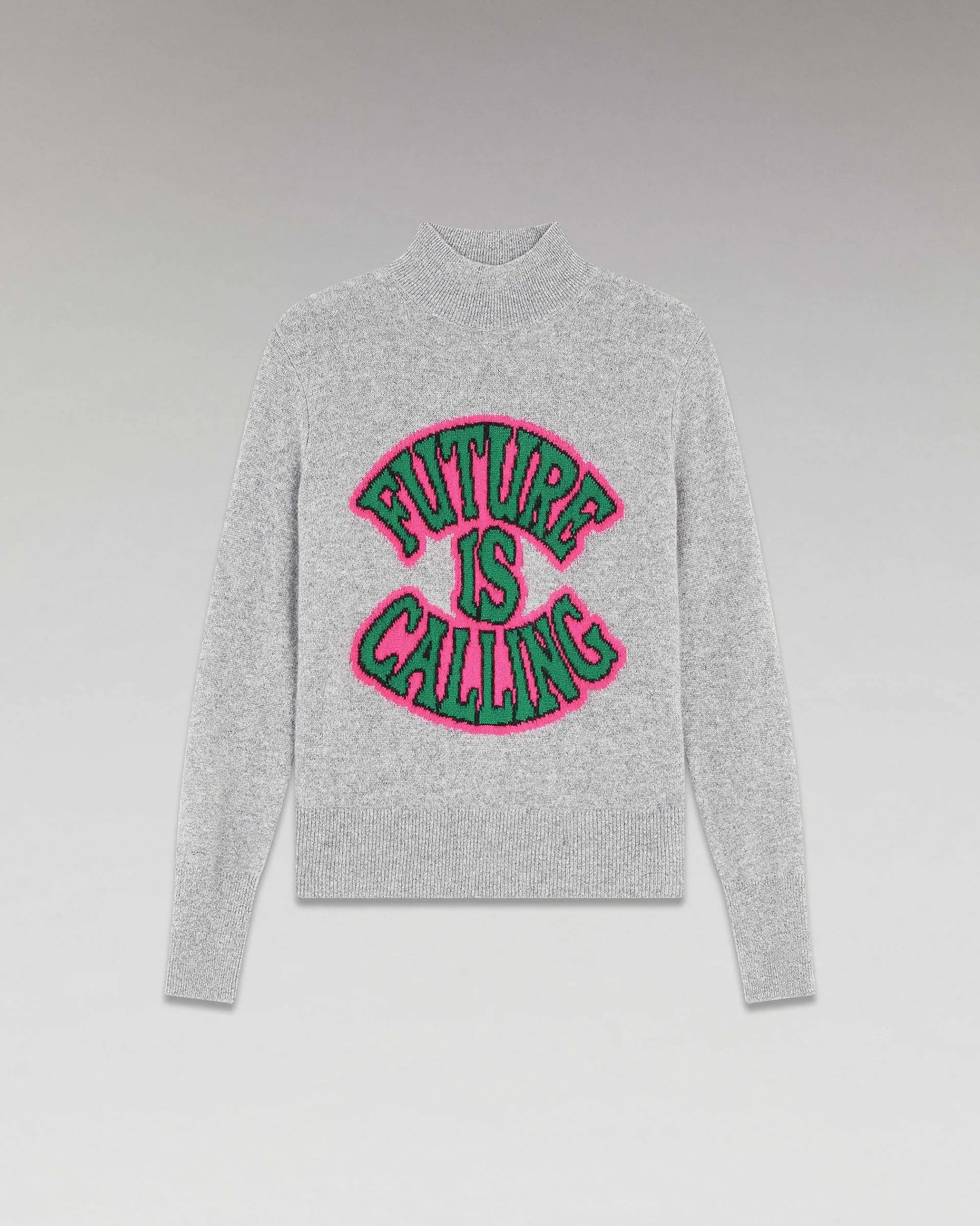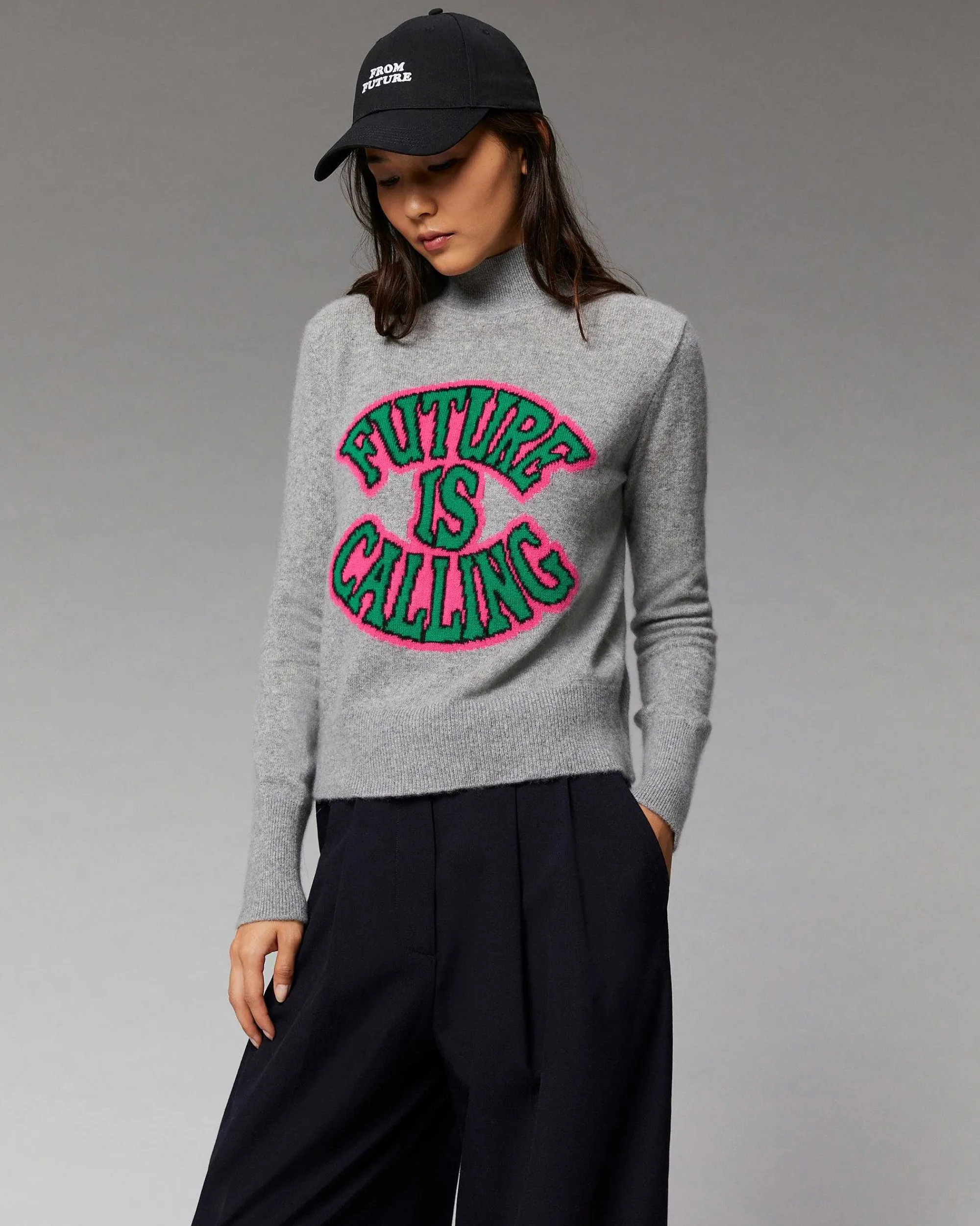 Infiniment Doux, Ce Pull Court Confectionné En Cachemire 2 Fils Est Muni D’Un Col Montant, De Bords Côtelés Et De Manches Longues. Léger Et Audacieux, Un Message En Jacquard « Future Is Calling » Se Dévoile, Vous Invitant À Répondre À L’Appel Du Futur Avec Style. Idéal Pour Réchauffer Votre Allure, Il S’Associe Aussi Bien À Une Jupe Satinée Ou Qu’Un Jean Décontracté.