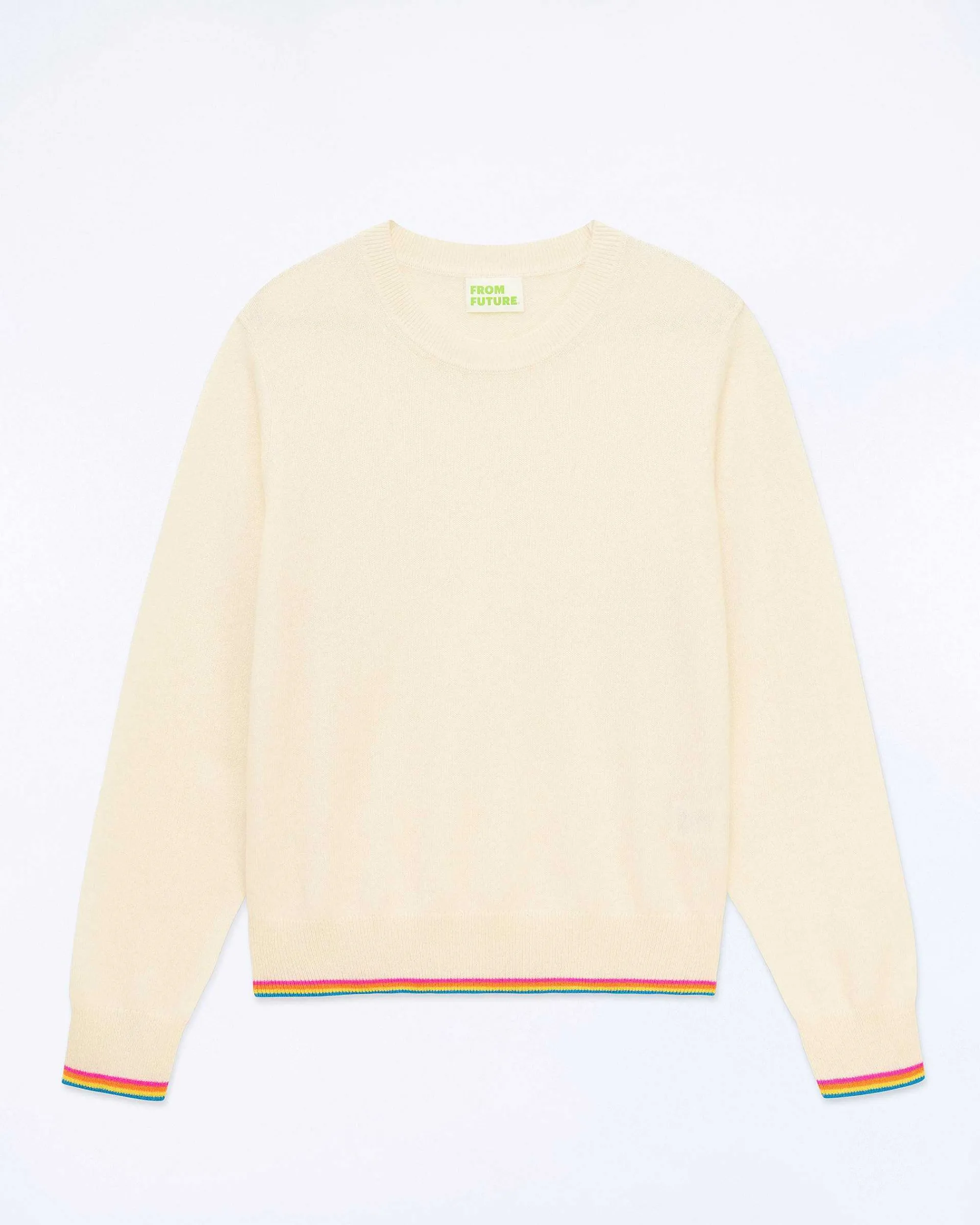 Élégance Cosmique Et Lignes Futuristes Pour Ce Pull En Cachemire 2 Fils Infiniment Doux. Muni D’Un Col Rond, De Manches Longues Et De Bords Côtelés, Il Confère Une Silhouette Audacieuse, Ponctuée De Liserés Multicolores Au Bas. Facile À Mixer, Il S’Associe À Un Jean Droit Ou Un Pantalon Ample.