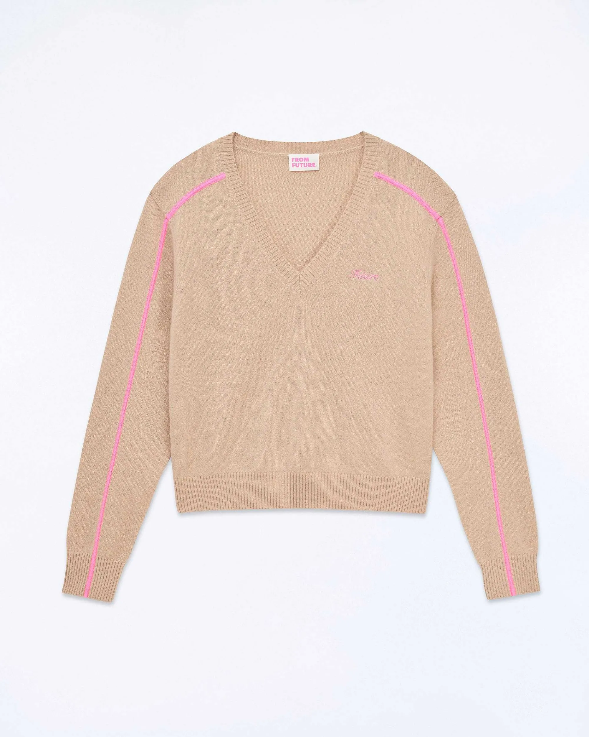 Confectionné En Cachemire 2 Fils, Ce Pull Court Séduit Par Sa Douceur Céleste Et Ses Détails Contrastés. Muni D’Un Col V Et De Bords Côtelés, Il Dévoile Des Lignes Fines Le Long Des Manches Et Une Signature « Future » Sur La Poitrine Pour Créer Une Allure Captivante. Facile À Mixer, Il S’Associe À Un Jean Droit Ou Un Pantalon Ample.