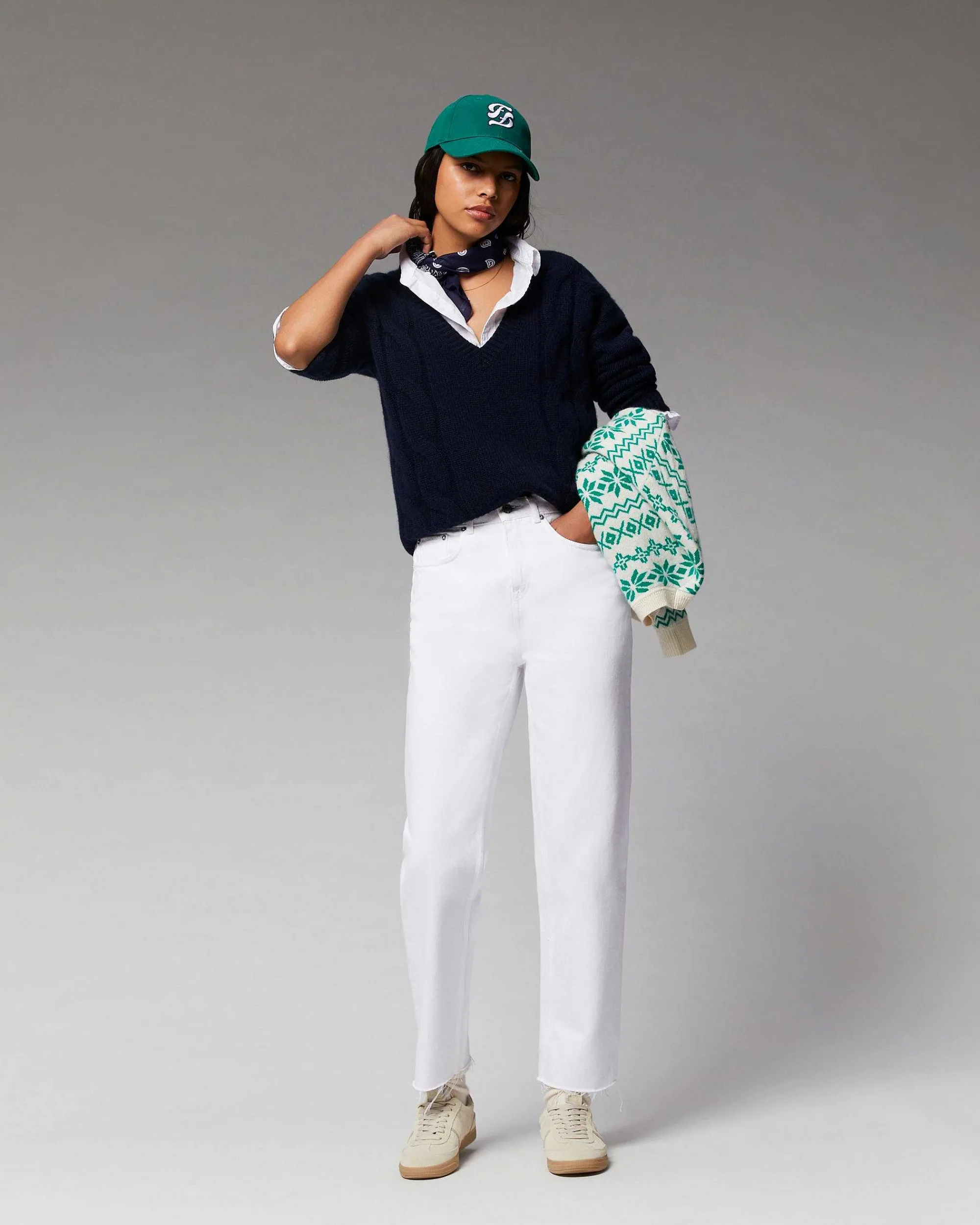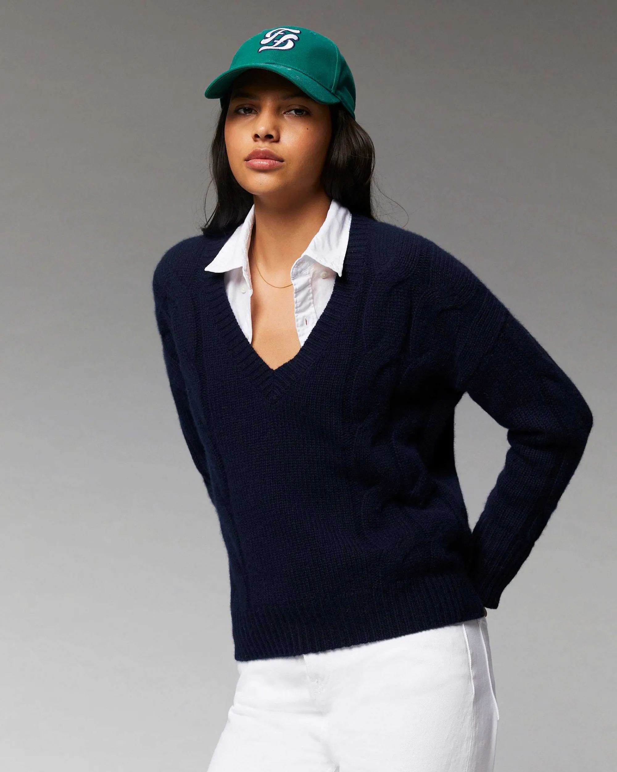 Enveloppez-Vous De Douceur Avec Ce Pull Oversize Confectionné En Cachemire Épais 10 Fils. Muni De Manches Longues Et De Bords Côtelés, Il Révèle Un Col En V Et Des Torsades Pour Twister Votre Allure Futuriste Avec Audace. À Porter Seul Ou Par Dessus Une Chemise, Elle S’Associe À Un Jean Casual Et Une Casquette Signature.