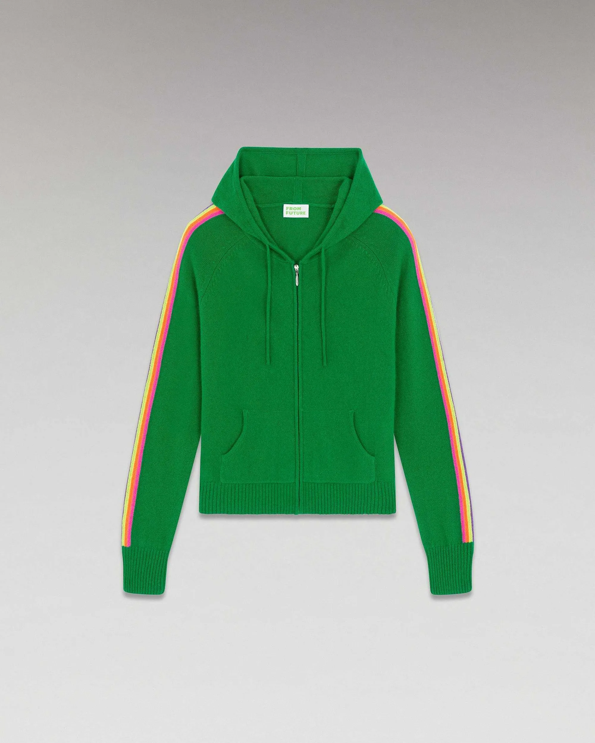 Préparez Vous À Être Télétransportée Dans Un Monde De Douceur Avec Ce Hoodie En Cachemire Léger 2 Fils. Orné De Bandes Multicolores Le Long Des Manches, Il Est Muni D’Une Fermeture Zippée Et D’Une Capuche.