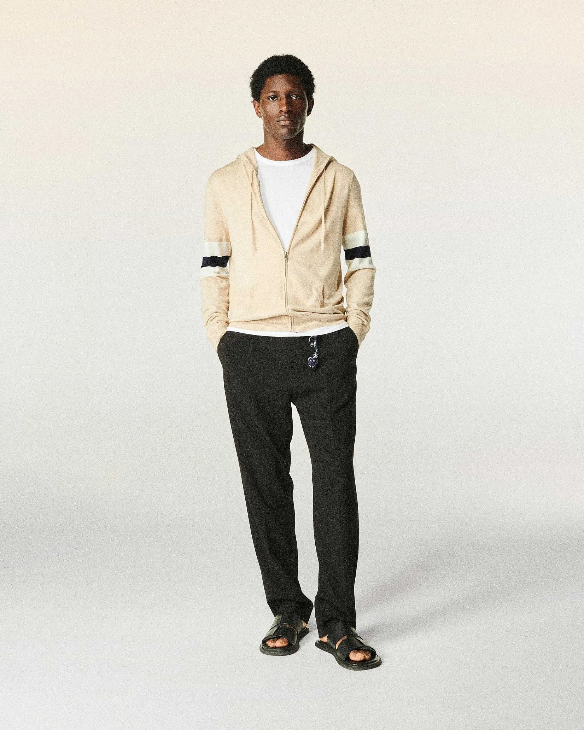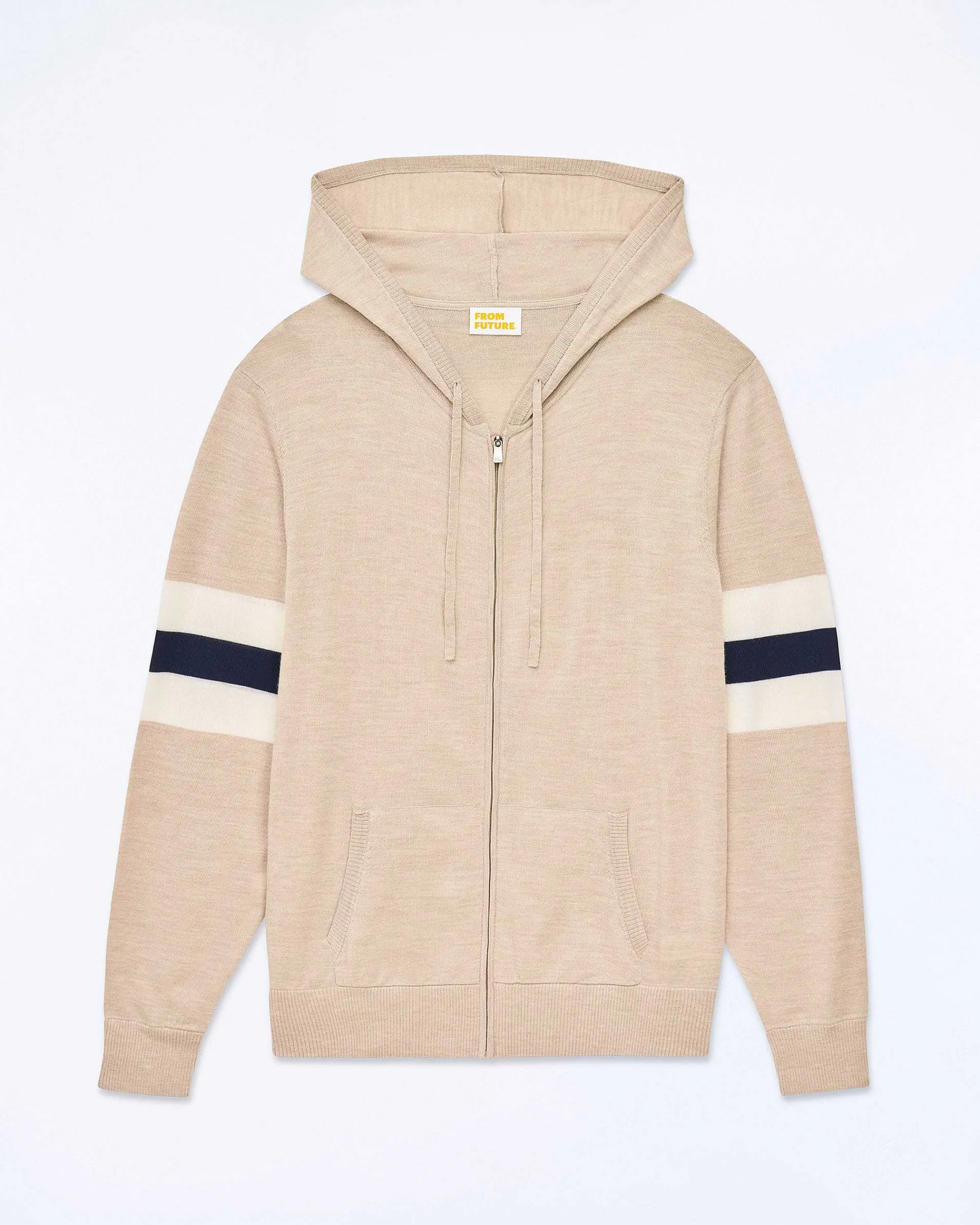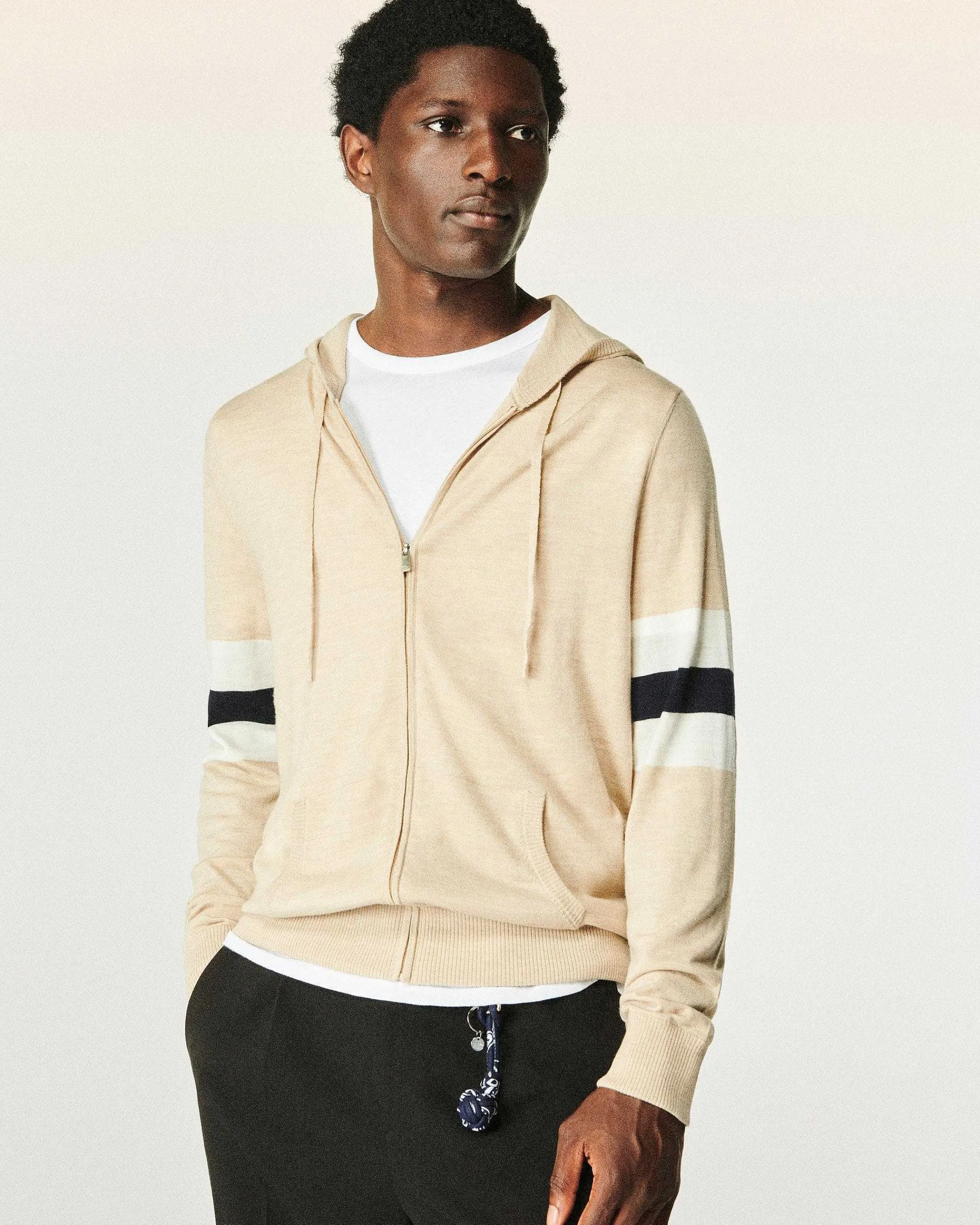 Explorez Les Horizons D’Un Vestiaire Futuriste Avec Ce Pull Hoodie Confectionné En Laine Mérinos Extra Fine. Muni D’Une Capuche À Cordons, D’Une Fermeture Zippée Et De Manches Longues, Il Dévoile Deux Poches Et Des Bords Côtelés. Ses Bandes Bicolores Aux Manches Apportent Une Touche D’Audace Et Rehaussent L’Allure. Facile À Mixer, Il S’Associe Aisément À Un Jean Casual Ou Un Jogging Droit.