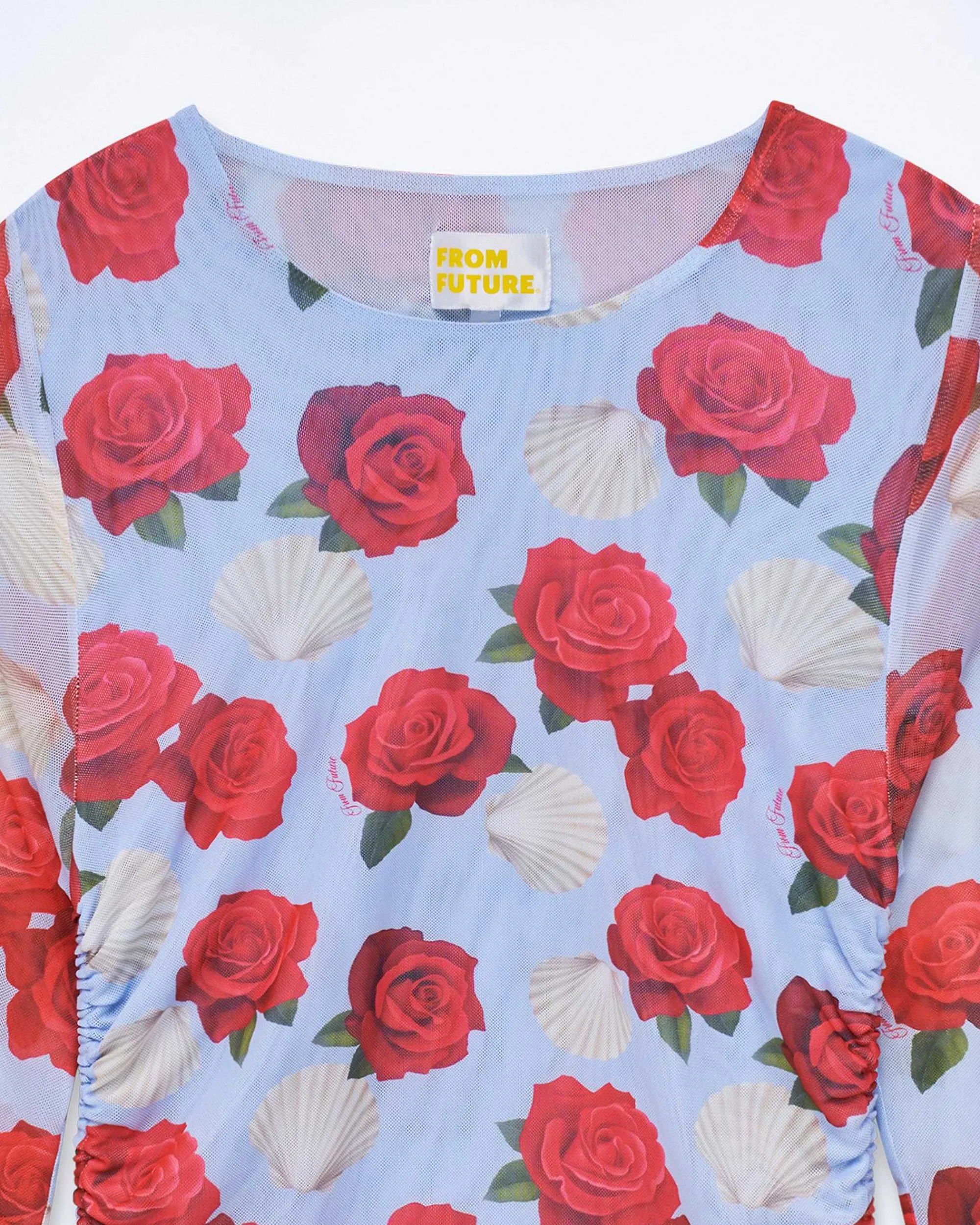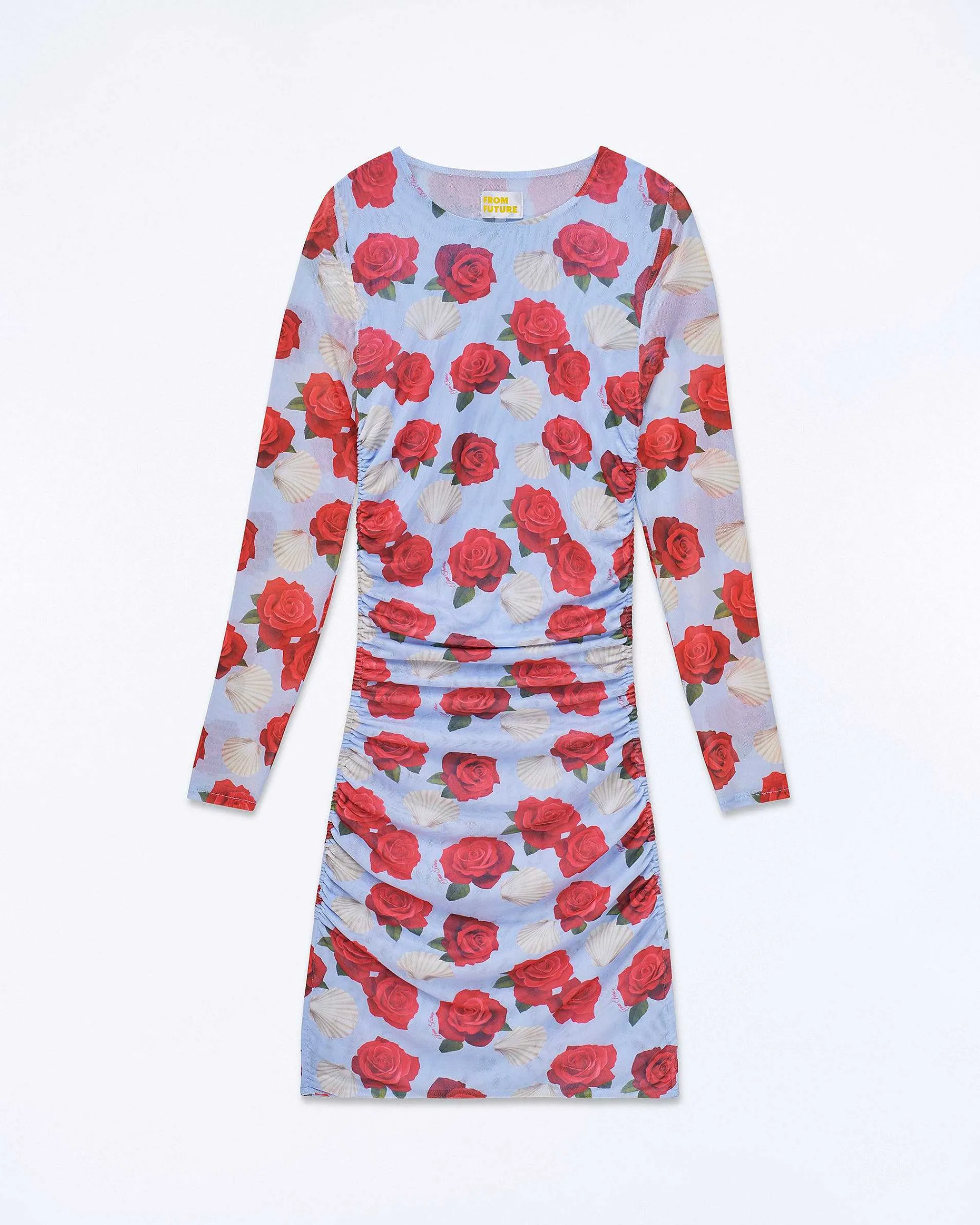 Ornée D’Un Imprimé Rose Coquillage, Cette Robe Courte Apporte Une Touche D’Audace À Votre Silhouette Futuriste. Muni D’Un Col Rond Et De Manches Longues, Elle Dévoile Un Jeu De Fronces Pour Une Allure Élégante Et Ajustée.