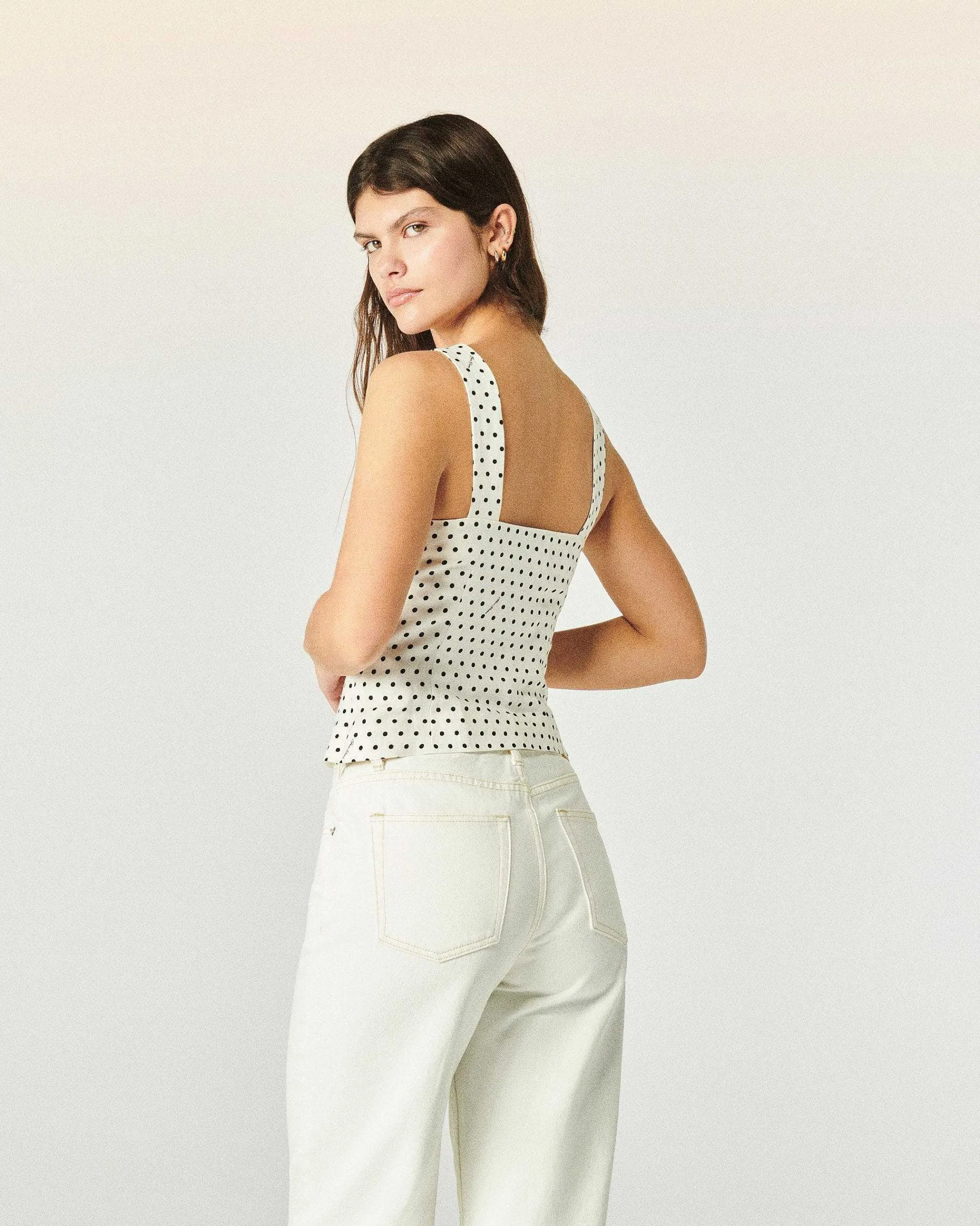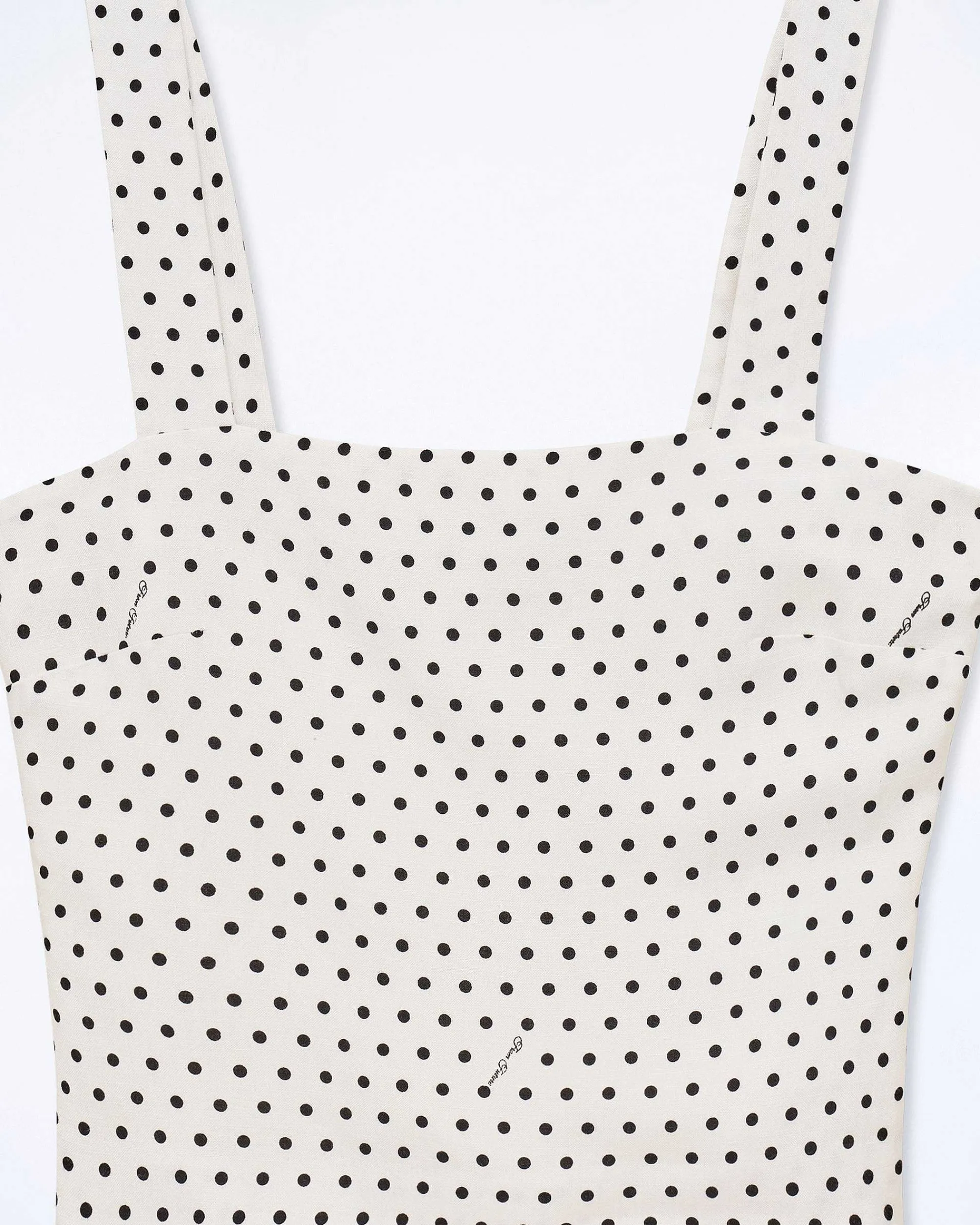 Telle Une Constellation Céleste, Un Imprimé Pois S’Invite Sur Ce Top Élégant Et Audacieux. Muni De Bretelles Larges Et D’Un Décolleté Droit, Il Structure Votre Silhouette Futuriste Et Se Mixe Aisément À Un Jean Droit Ou Une Jupe Fluide.