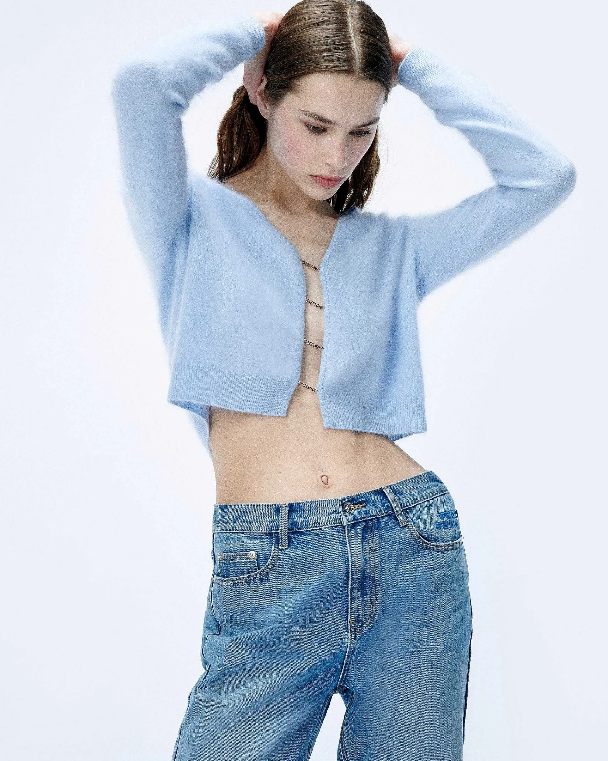 Misez Sur Allure De Cosmic Girl Dans Ce Pull Court Confectionné En Cachemire 2 Fils Muni De Manches Longues. Son Décolleté Plongeant Dévoile Une Fermeture À Plaques From Future.