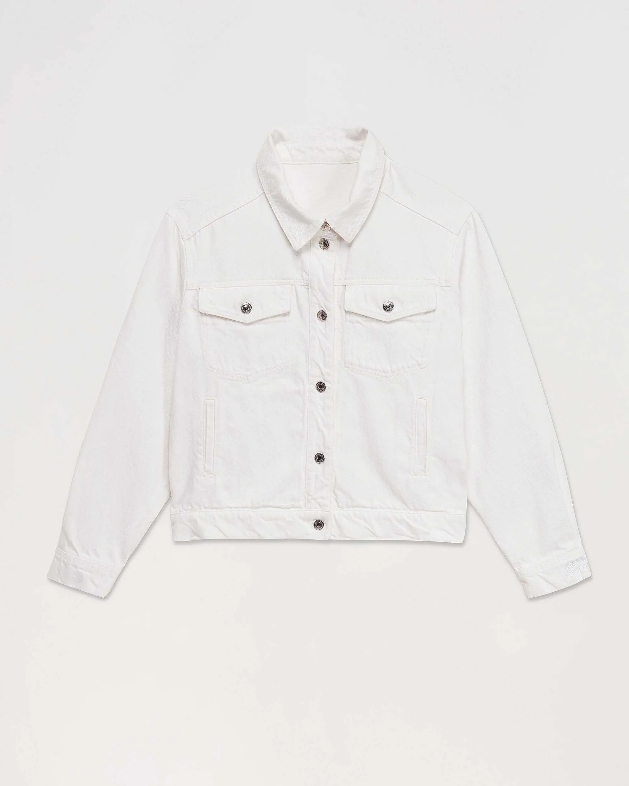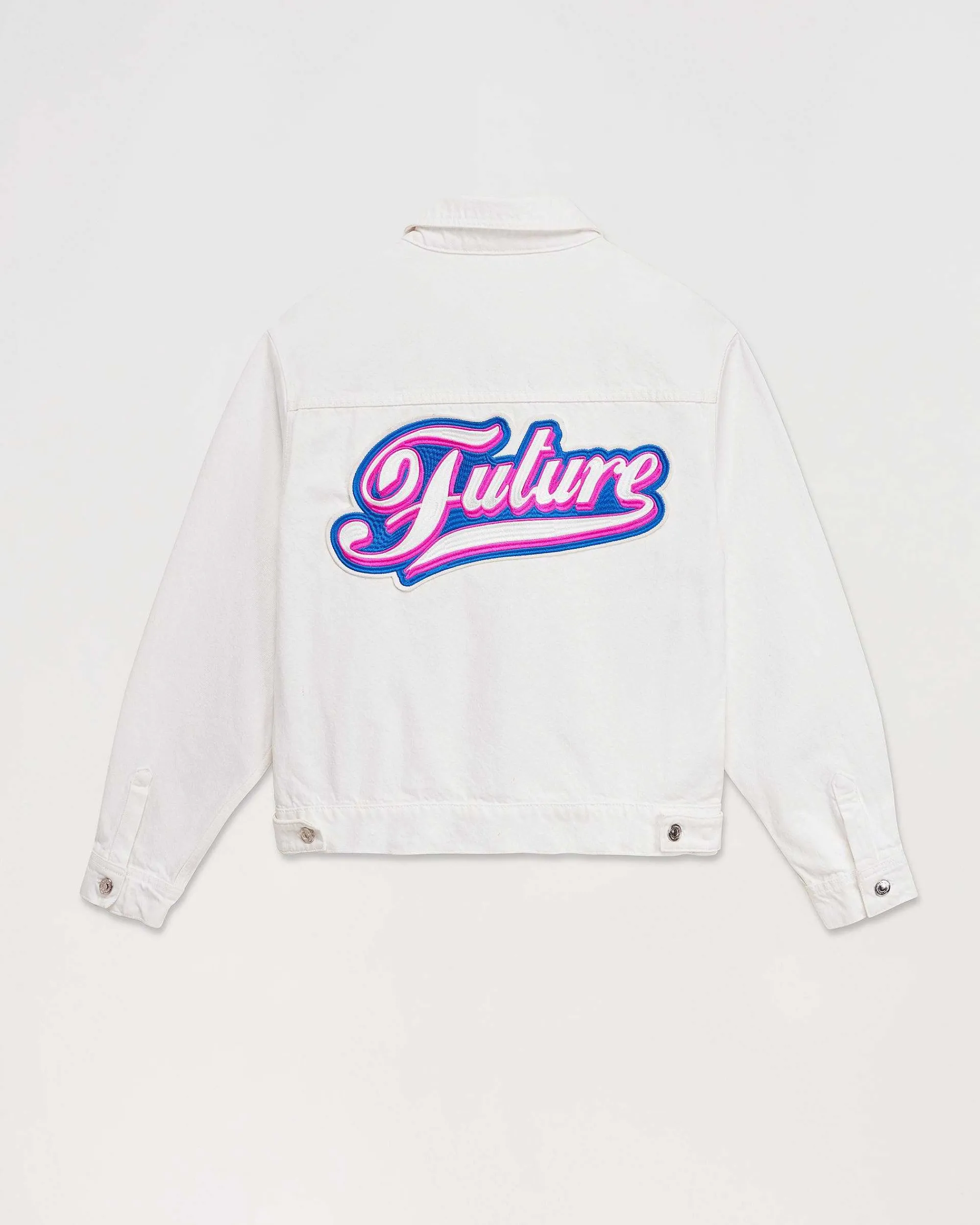 Résolument Cool, Cette Veste Surchemise En Jean Munie De Manches Longues Et De Poignets Boutonnés Dévoile Une Signature « Future » Brodée Au Dos.