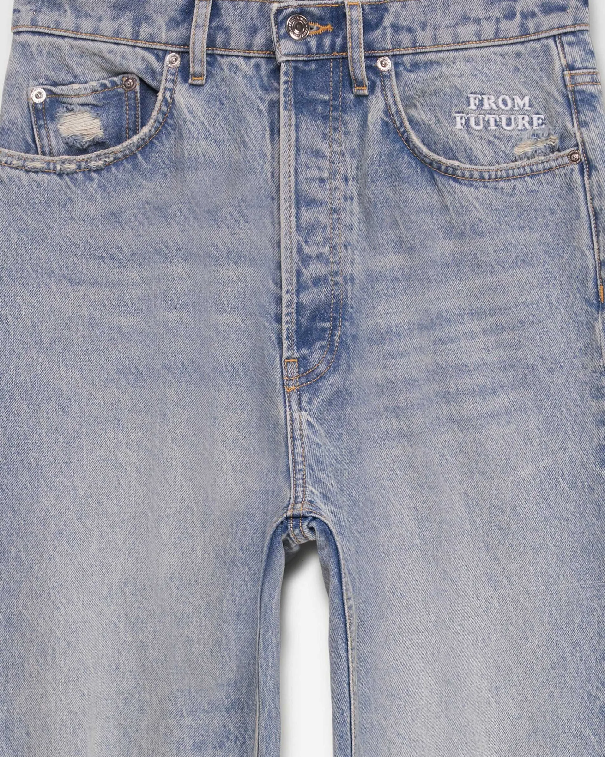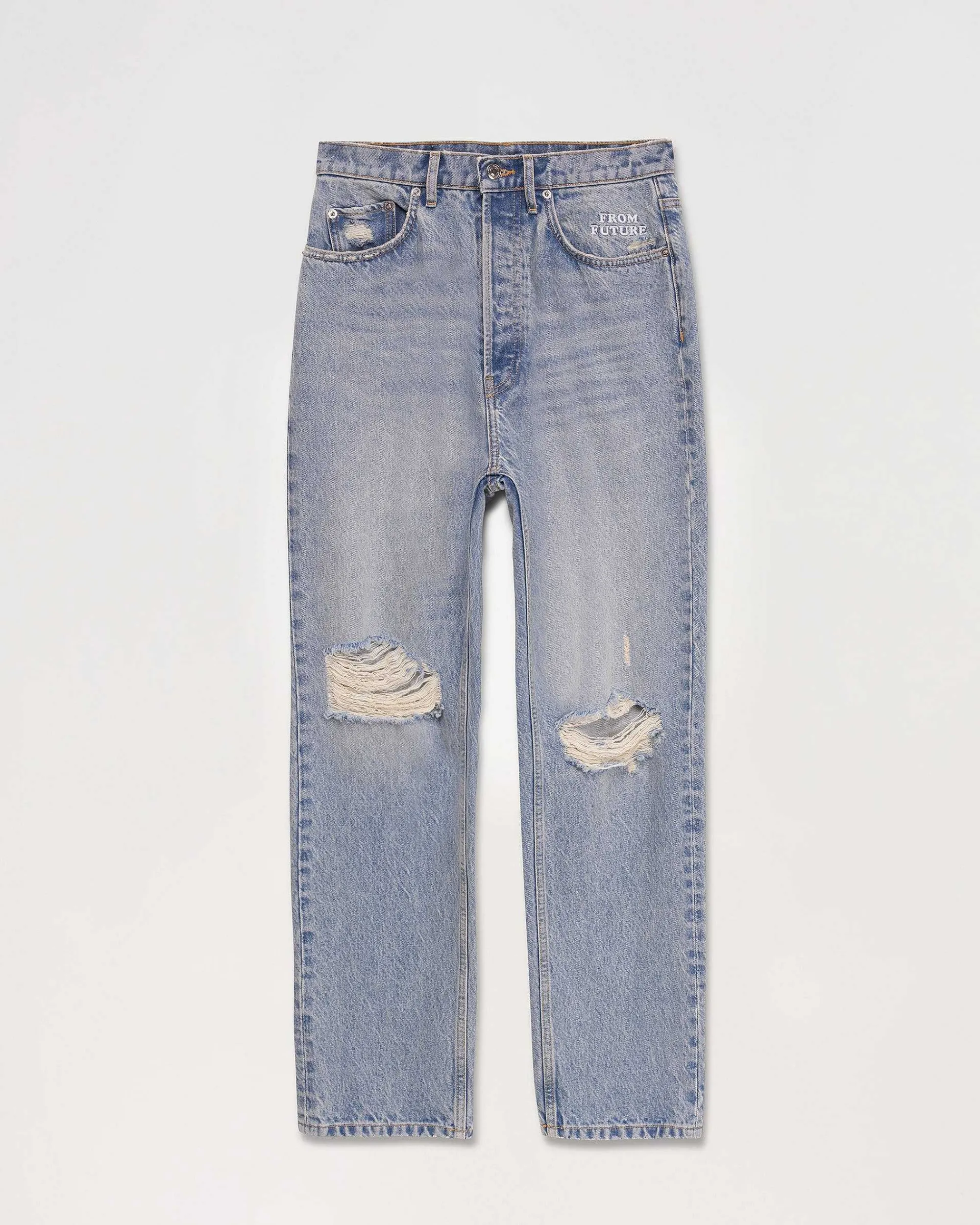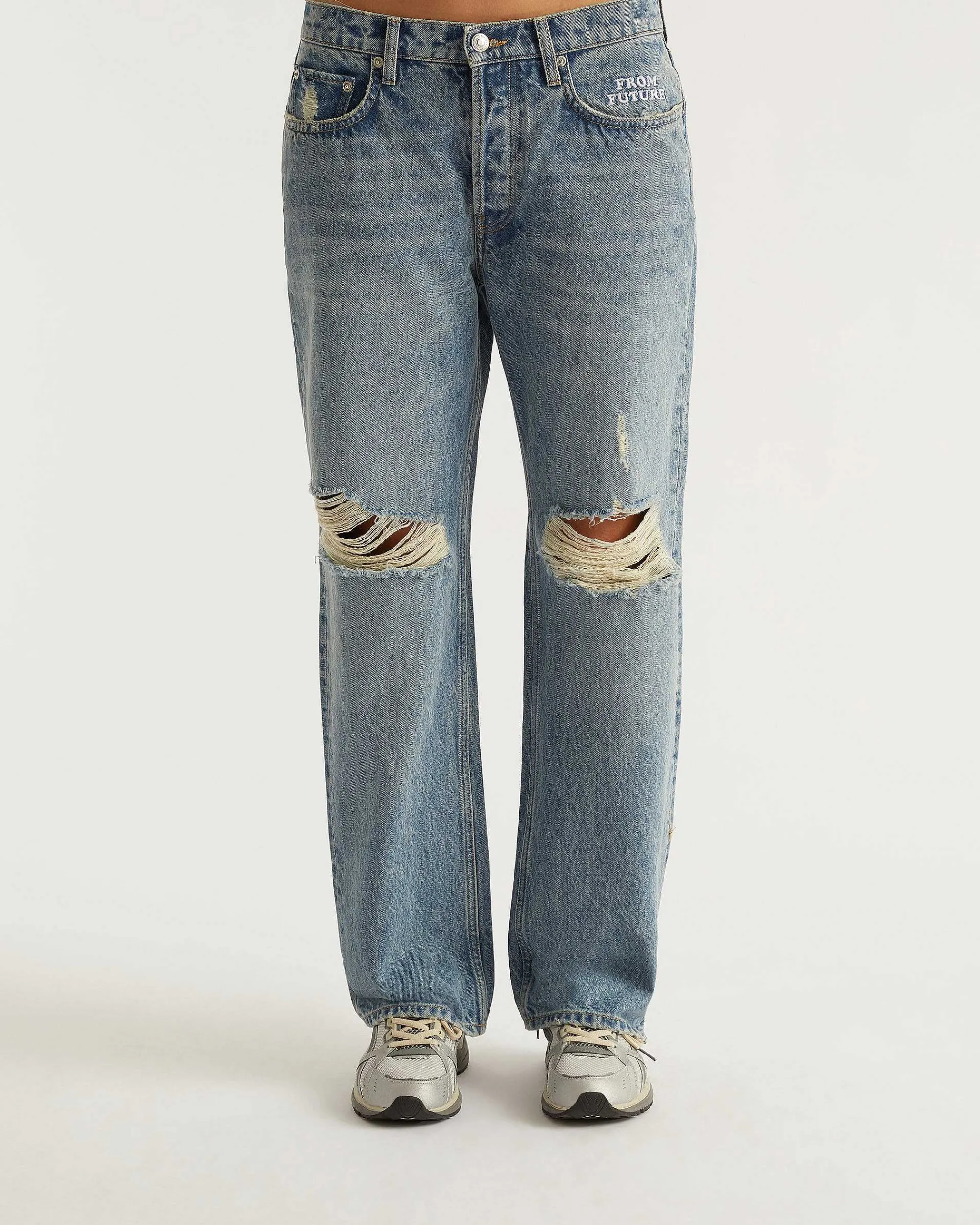 « Résolument Cool, Le Jean Jonah Muni D’Une Coupe Droite Dévoile Des Trous, De Multiples Poches Et Une Broderie « »From Future » ».