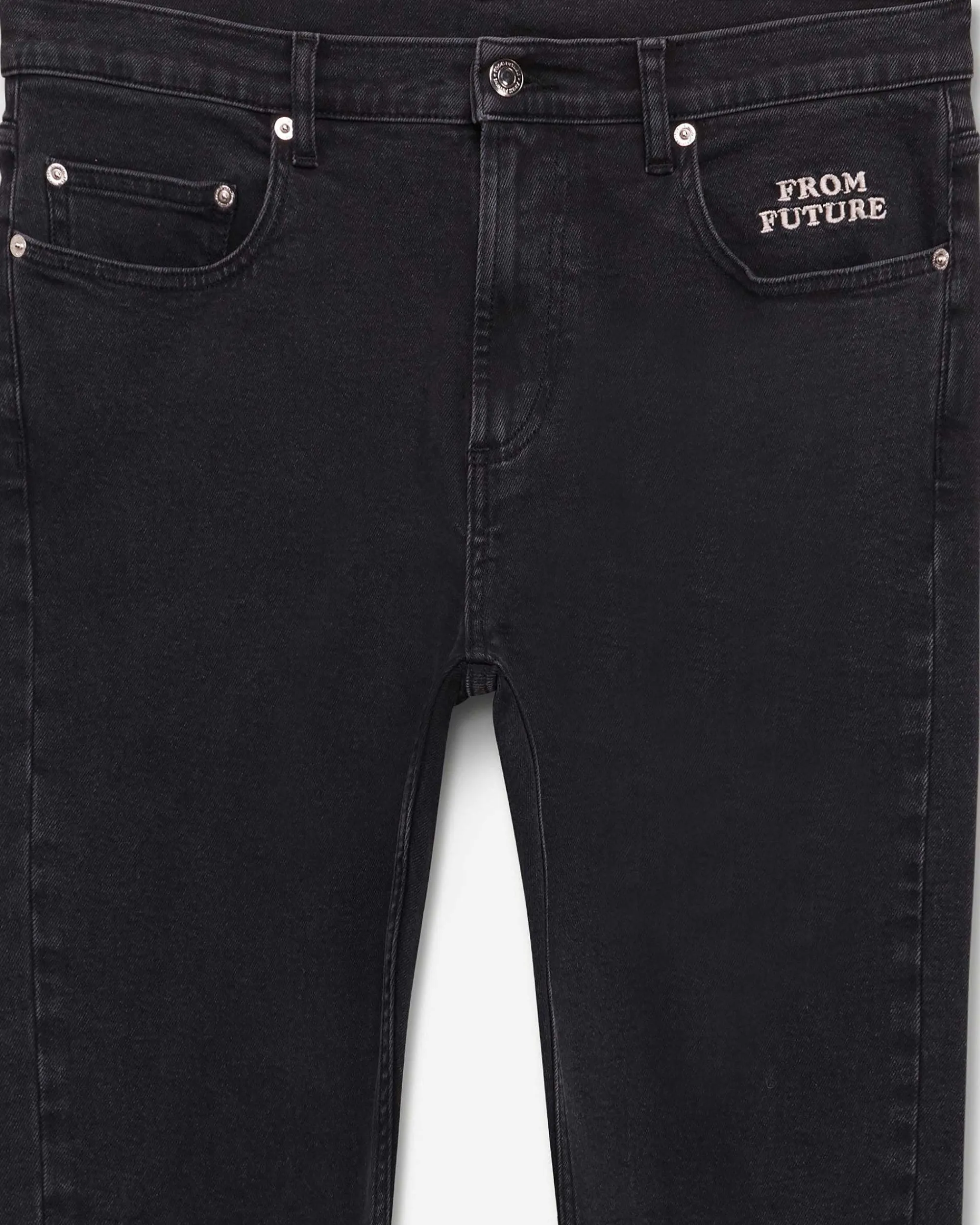Cool Et Casual, Le Jean Skinny John Muni D’Une Coupe Slim Dévoile De Multiples Poches Et Une Broderie « From Future ».