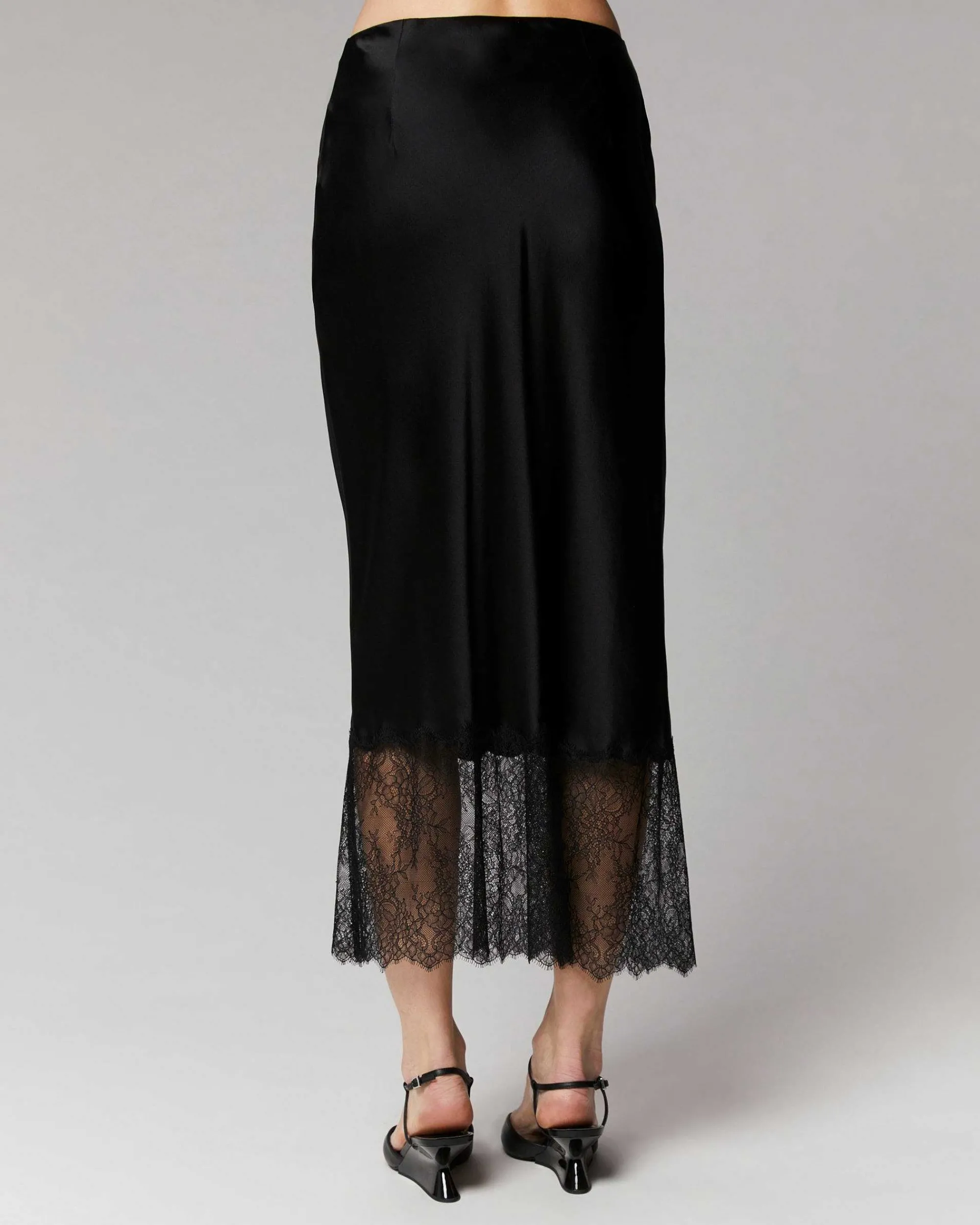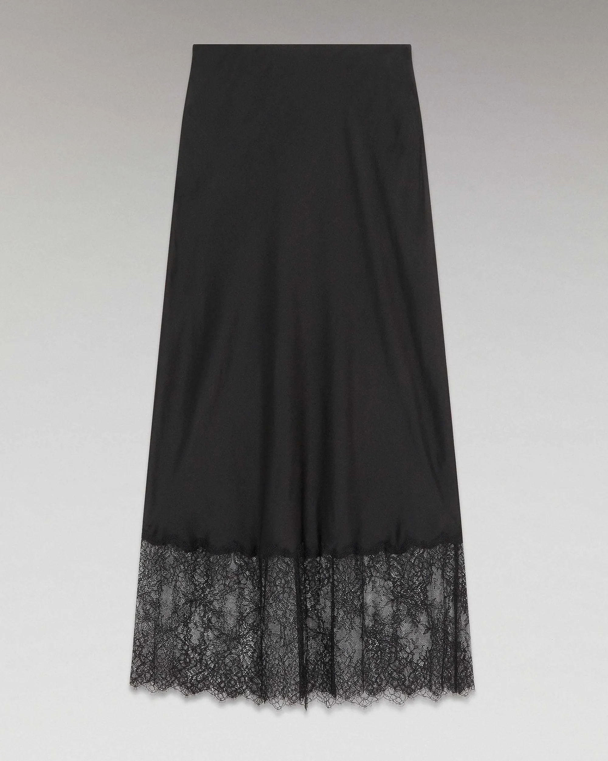 Empreinte De Douceur Et De Délicatesse, Cette Jupe Mi-Longue Incarne Une Vision Futuriste De La Sophistication. Confectionnée En Satin De Soie Léger, Brillant Et Soyeux, Elle Dessine Une Silhouette Structurée, Marquée D’Une Taille Élastiquée. À La Fois Chic Et Glamour, Elle Offre Un Tombé Fluide Orné D’Un Jeu De Découpes Et De Bords En Dentelle. Idéal Pour Toutes Les Occasions, Mixez-Là À Un Gilet En Maille, Des Bijoux Et Une Paire D’Escarpins.