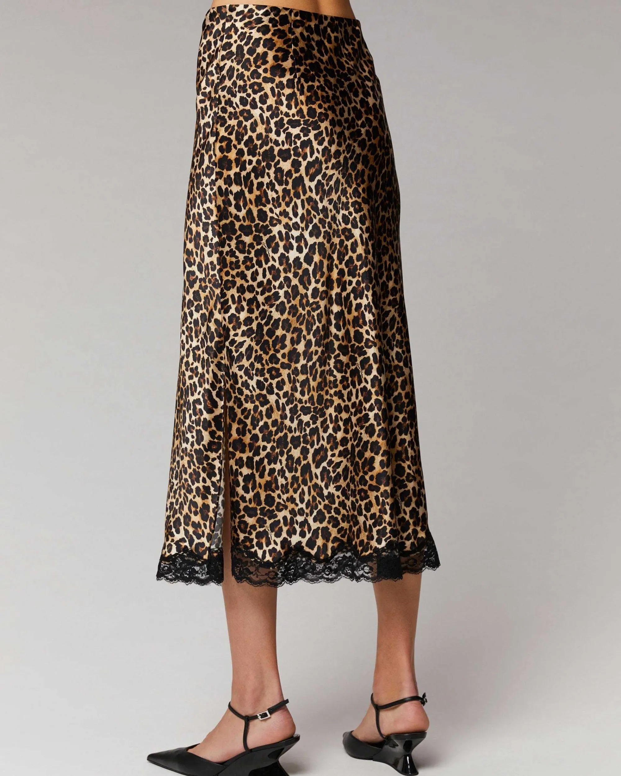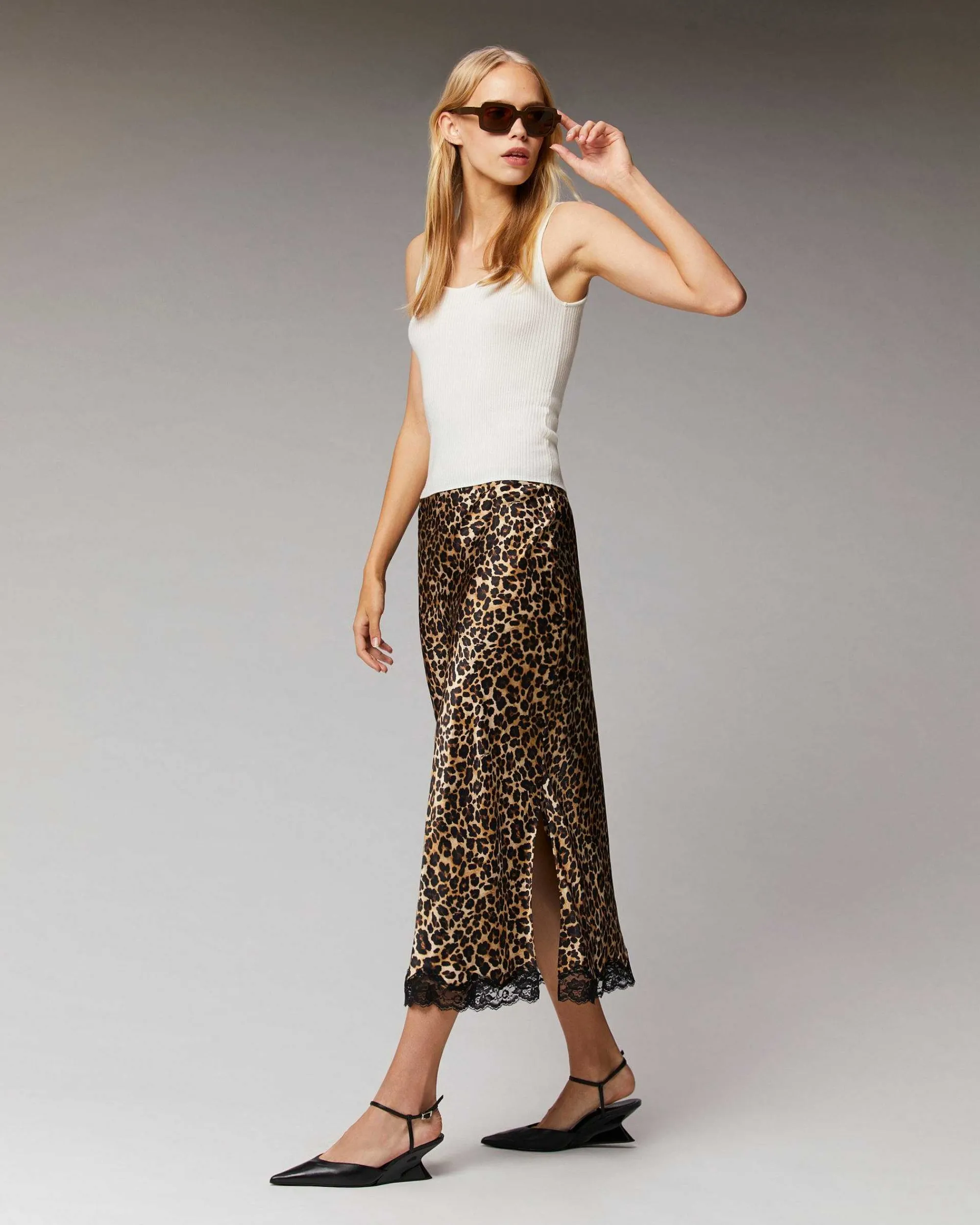 Fusion Audacieuse De Motifs Sauvages Et D’Élégance Futuriste, Cette Jupe Mi-Longue Vous Propulse Vers Des Horizons Inexplorés De Style. Confectionnée En Satin De Soie Léger Et Soyeux, Elle Se Pare D’Un Imprimé Léopard, D’Une Fente Sur Les Côtés Et De Bords En Dentelle. Élastiquée À La Taille, Elle Dévoile Une Silhouette Ajustée En Toute Fluidité. À Accessoiriser Selon Vos Envies, Elle Se Porte Sur Une Chemise Satinée Ou Un Top En Maille.
