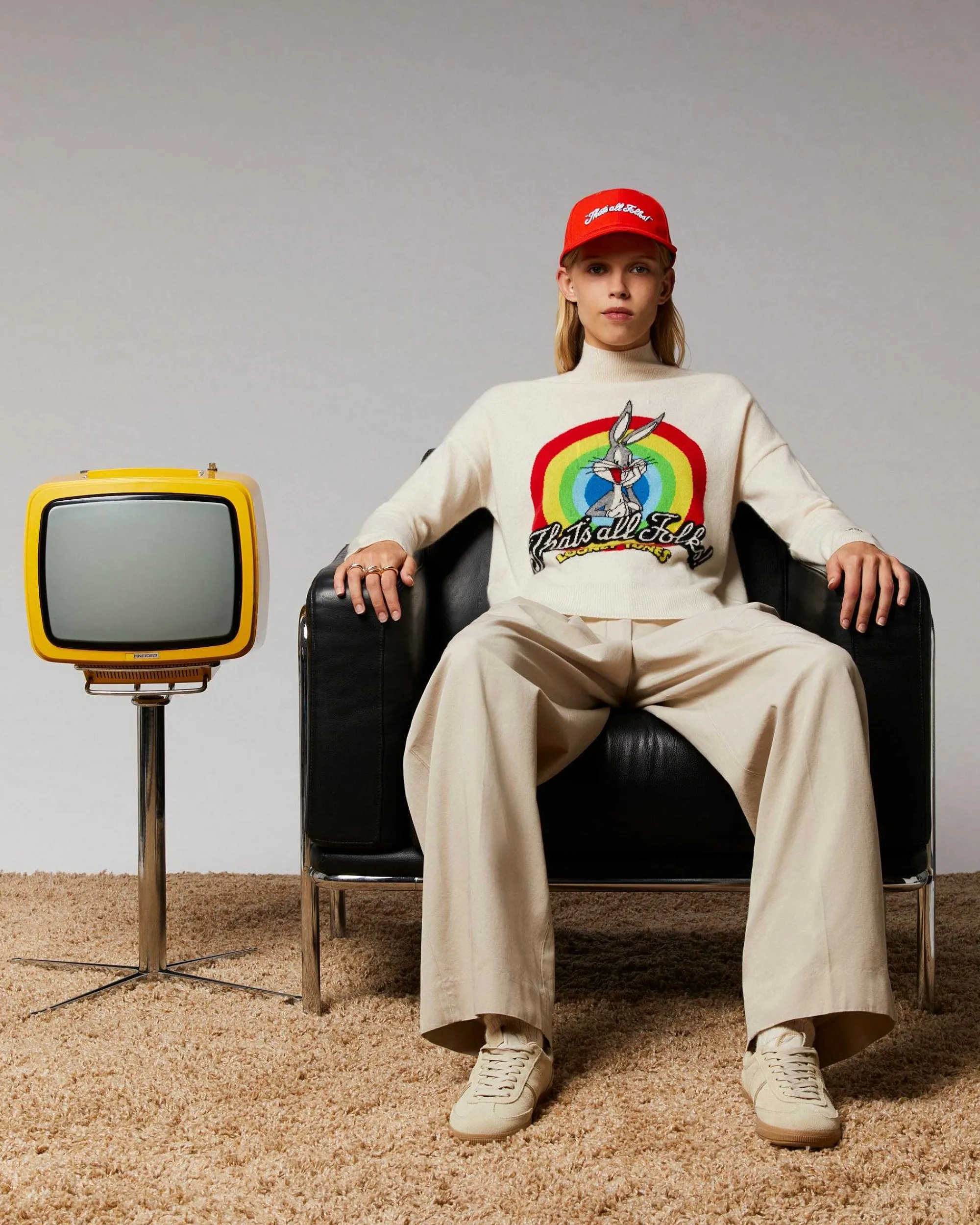 Bugs Bunny Est À L’Honneur Et S’Invite Sur Ce Pull Oversize Aux Couleurs Vibrantes. Confectionné En Cachemire 2 Fils, Il Est Muni D’Un Col Montant, De Manches Longues Et De Bords Côtelés. Insufflant Un Esprit Ludique Et Une Touche De Nostalgie, Il Dévoile L’Emblématique Slogan « That’S All Folks! » Signé Looney Tunes Et Une Broderie Signature « From Future » Sur Le Poignet Gauche.