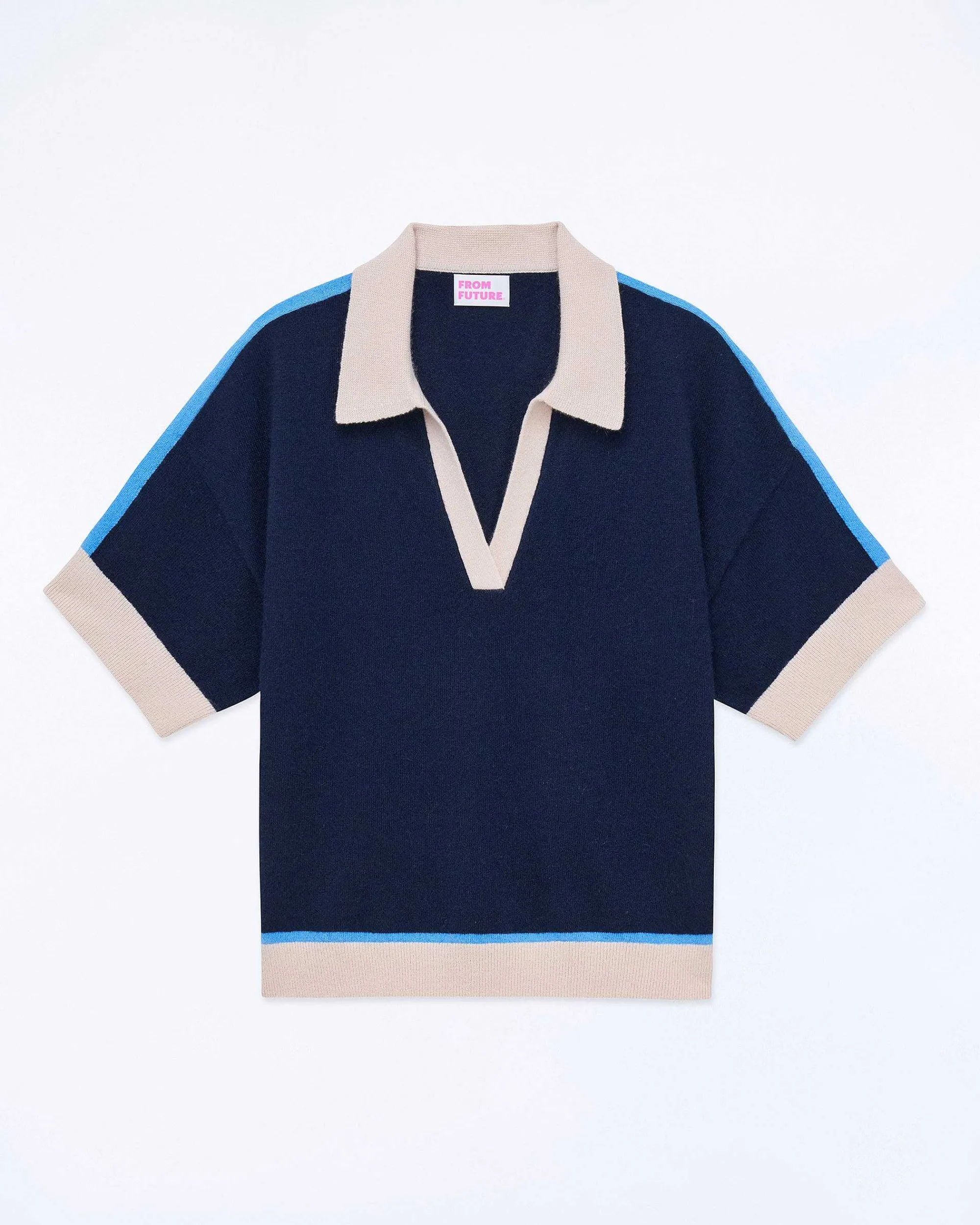 Jeux De Lignes Pour Ce Pull Court Et Oversize, En Cachemire 2 Fils. Muni De Manches Courtes, Il Affiche Un Col Polo En V Et Des Bords Côtelés Contrastés Pour Transcender Votre Allure Futuriste Au Quotidien. Mixez-Le À Un Jean Ample Pour Un Look Chic Et Casual.