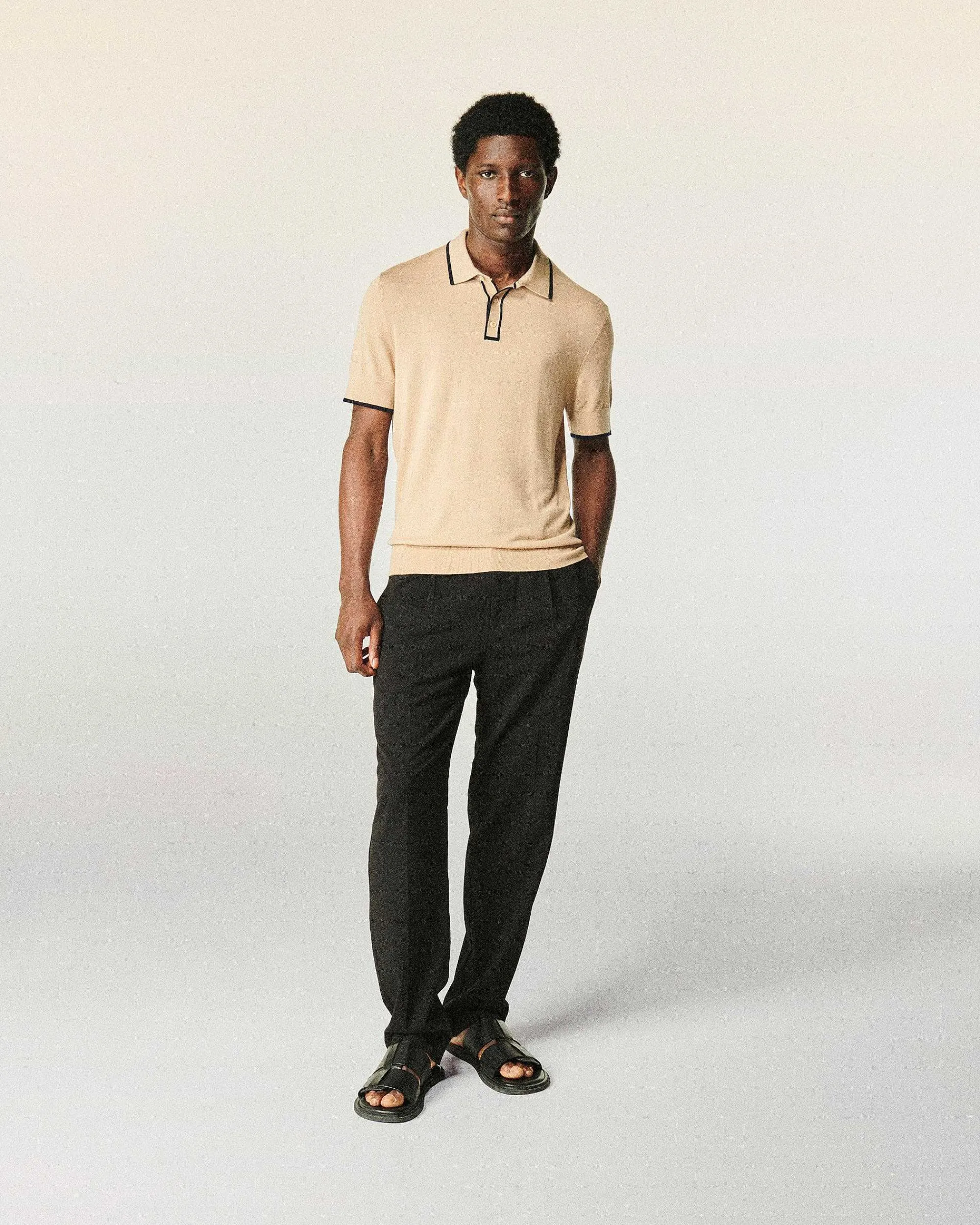Confectionné En Laine Mérinos, Ce Pull Infiniment Doux Rehausse Votre Silhouette Cosmique. Muni De Manches Courtes Et De Bords Côtelés, Il Dévoile Un Col Polo Ponctué D’Une Bande Contrastée Et Une Broderie Sur La Poitrine. Élégant Et Ajusté, Mixez-Le À Un Pantalon Droit Ou Un Jean Ample.
