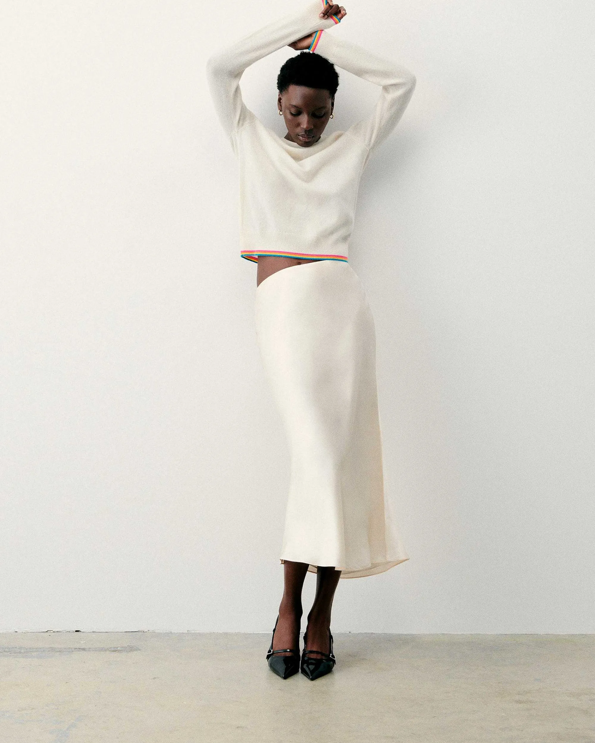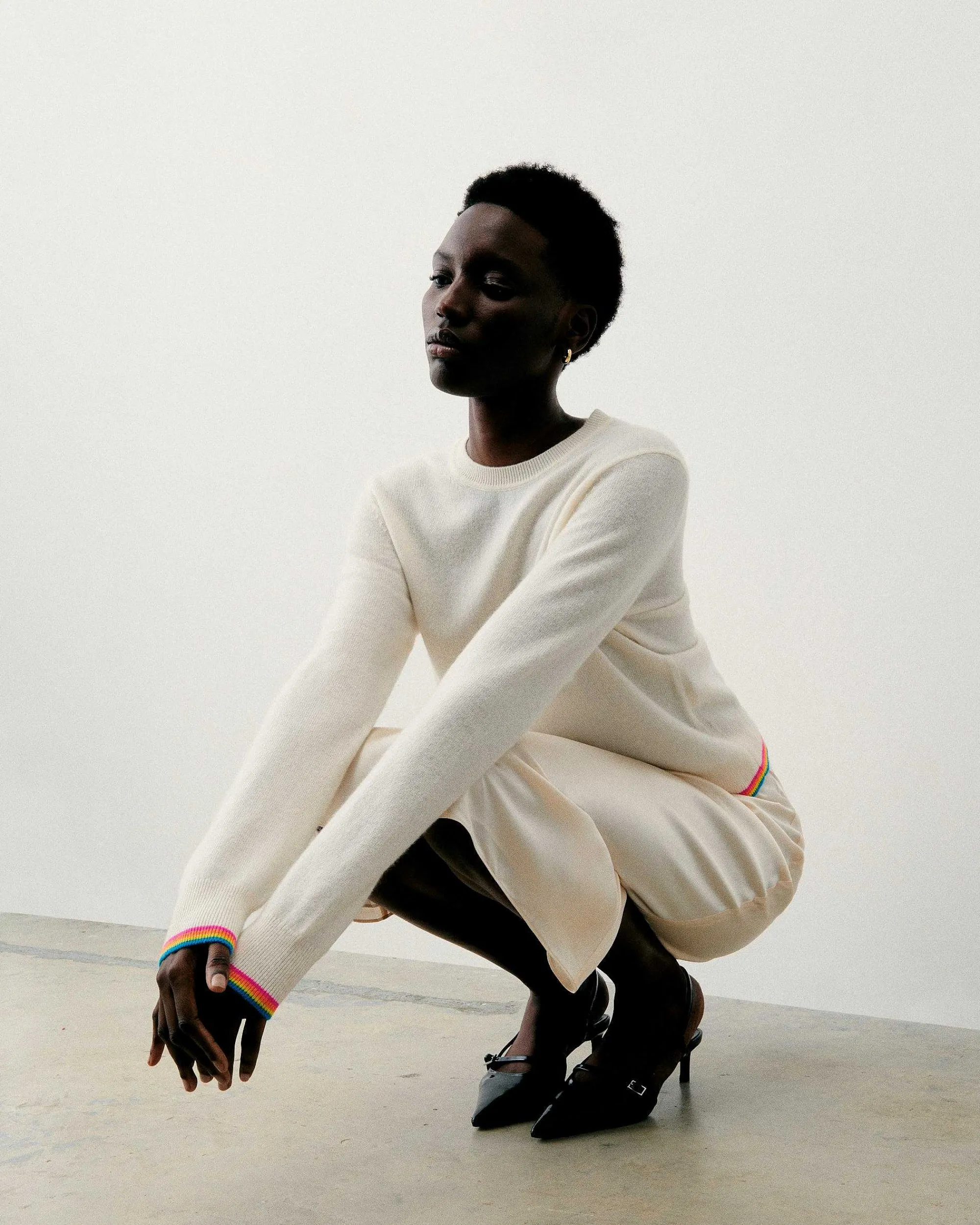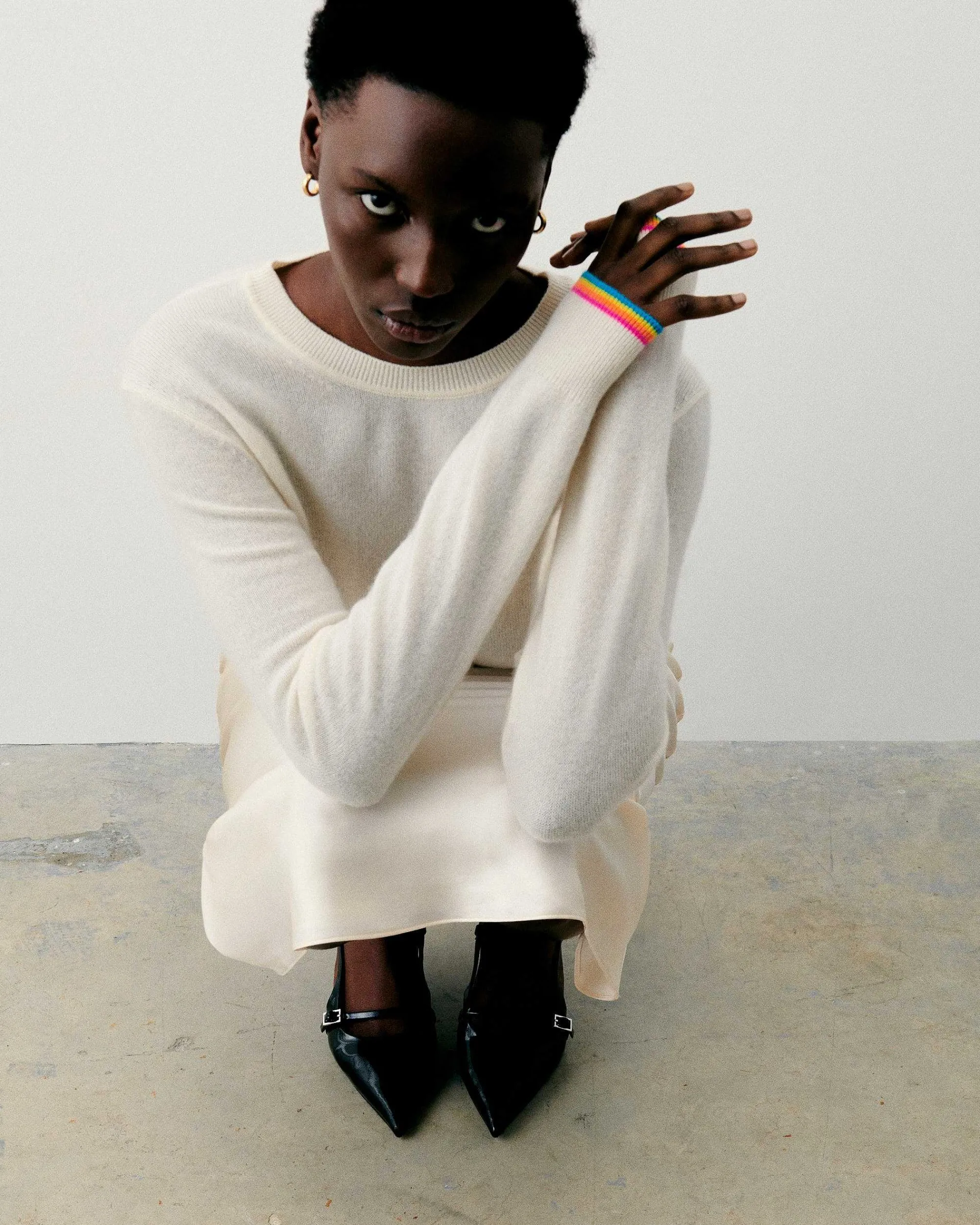 Élégance Cosmique Et Lignes Futuristes Pour Ce Pull En Cachemire 2 Fils Infiniment Doux. Muni D’Un Col Rond, De Manches Longues Et De Bords Côtelés, Il Confère Une Silhouette Audacieuse, Ponctuée De Liserés Multicolores Au Bas. Facile À Mixer, Il S’Associe À Un Jean Droit Ou Un Pantalon Ample.