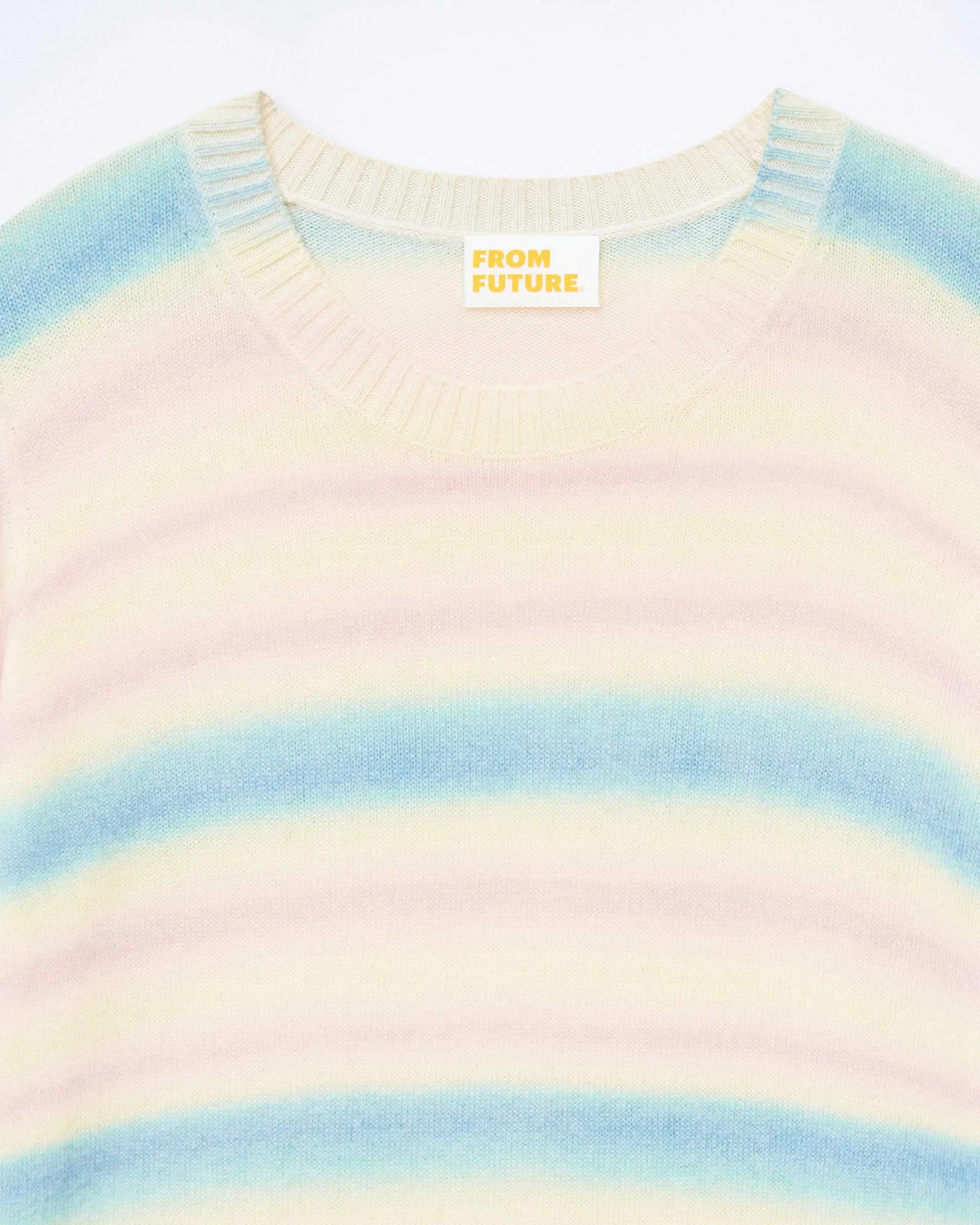 Confectionné En Cachemire 2 Fils, Ce Pull Court Incarne L’Élégance Céleste, Où Les Nuances Douces Se Mêlent Aux Rayures Fondues. Muni D’Un Col Rond, De Manches Longues Et De Bords Côtelés, Il Confère Une Silhouette Captivante. Complétez Votre Look Futuriste Avec Un Jean Ample Ou Une Jupe Fluide.