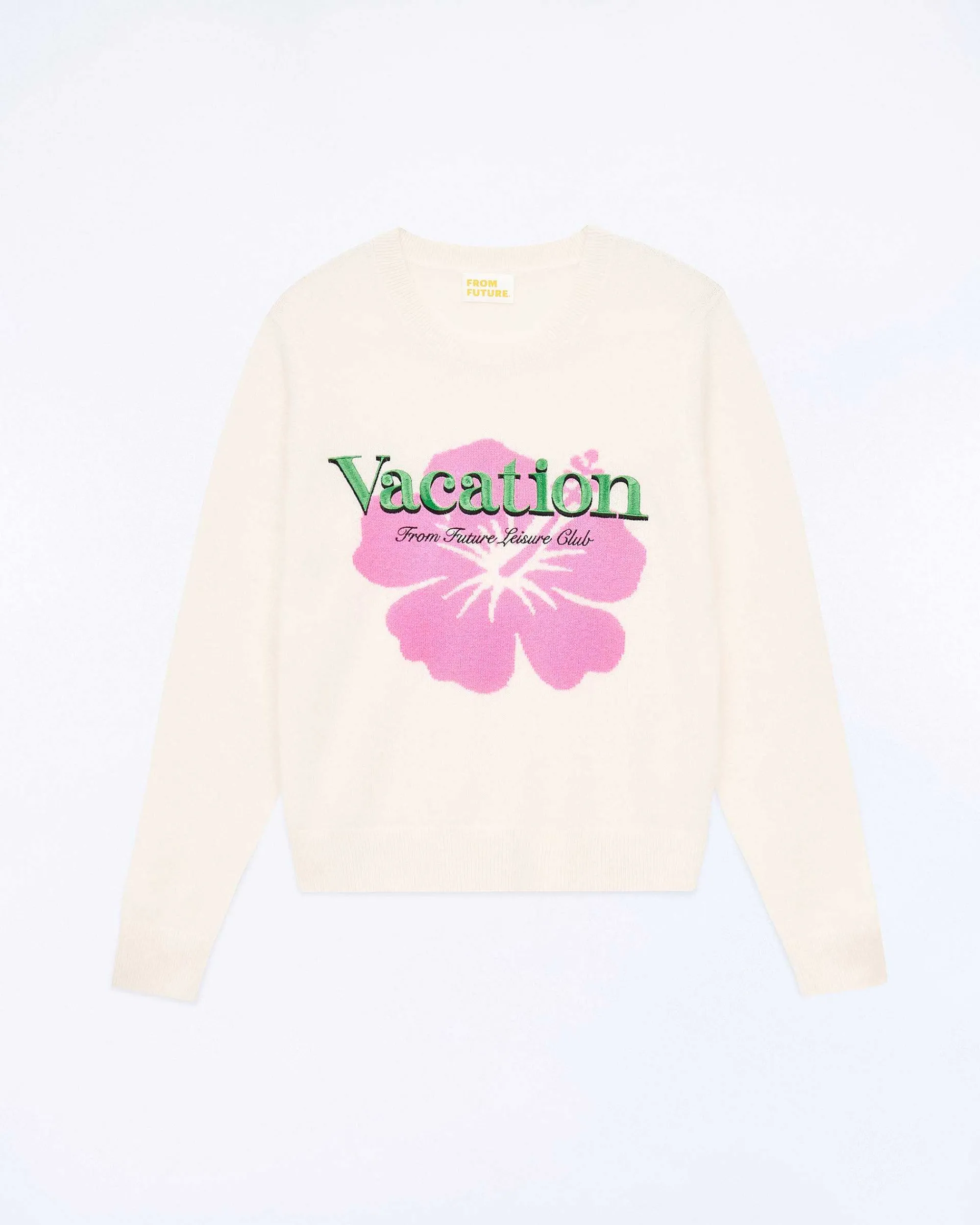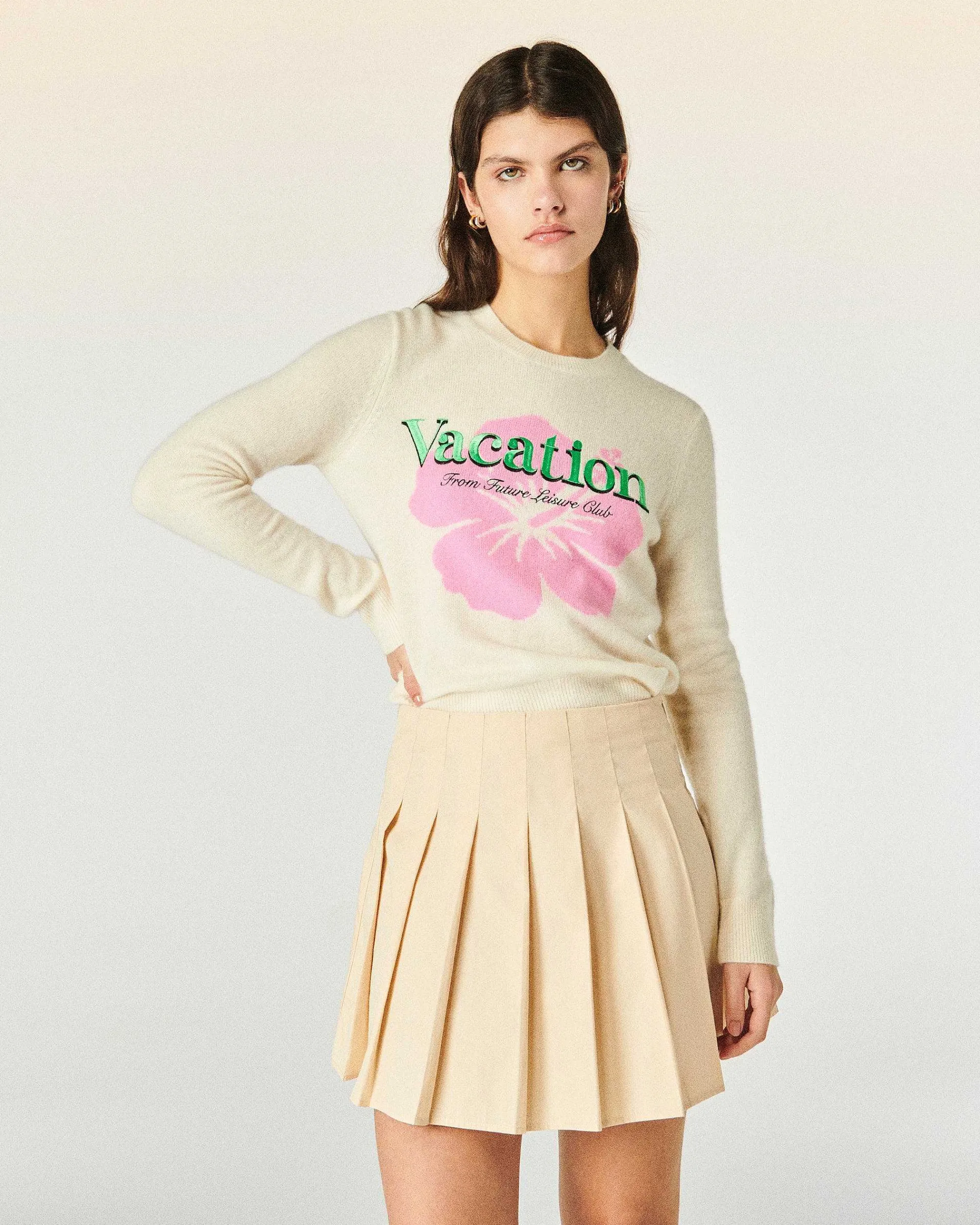 Inspiration Tropicale Et Couleurs Vibrantes : Ce Pull Confectionné En Cachemire 2 Fils Appelle Les Beaux Jours. Muni D’Un Col Rond, De Manches Longues Et De Bords Côtelés, Une Fleur De Tiaré Ornée D’Un Message « Vacation » S’Invite À L’Avant. Complétez Votre Look Futuriste Avec Une Jupe Fluide.
