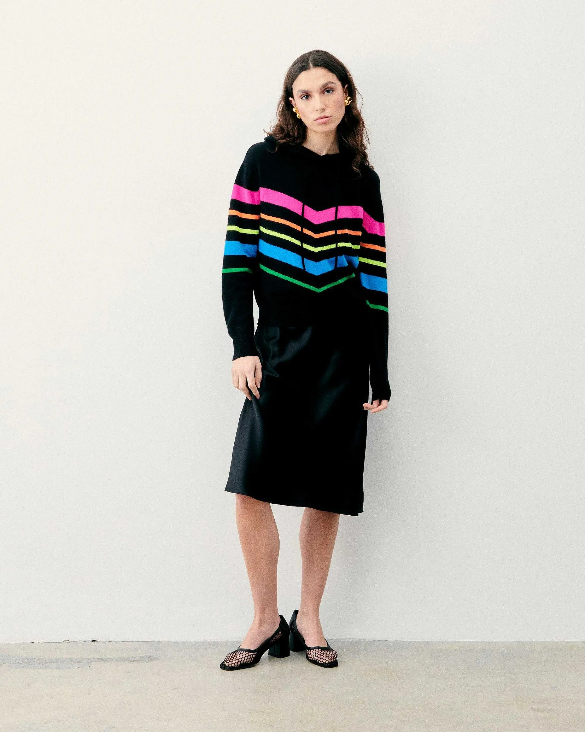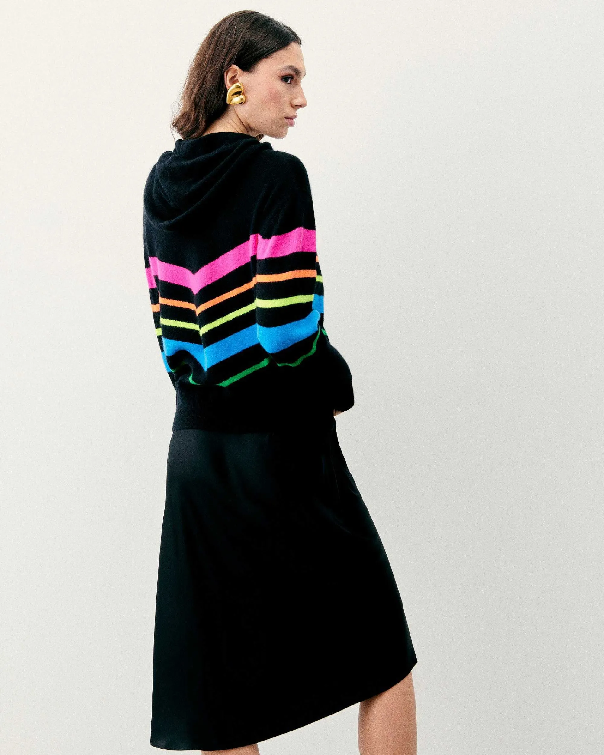 Beaucoup D’Allure Pour Ce Pull Hoodie Court, Muni D’Une Capuche À Cordons, De Manches Longues Et De Bords Côtelés. Confectionné En Cachemire 2 Fils, Il Dévoile Des Bandes Futuristes Aux Couleurs Vibrantes Pour Transcender Les Saisons Avec Audace. Mêlant Confort Et Douceur, Mixez-Le À Un T-Shirt Et À Votre Denim Préféré.