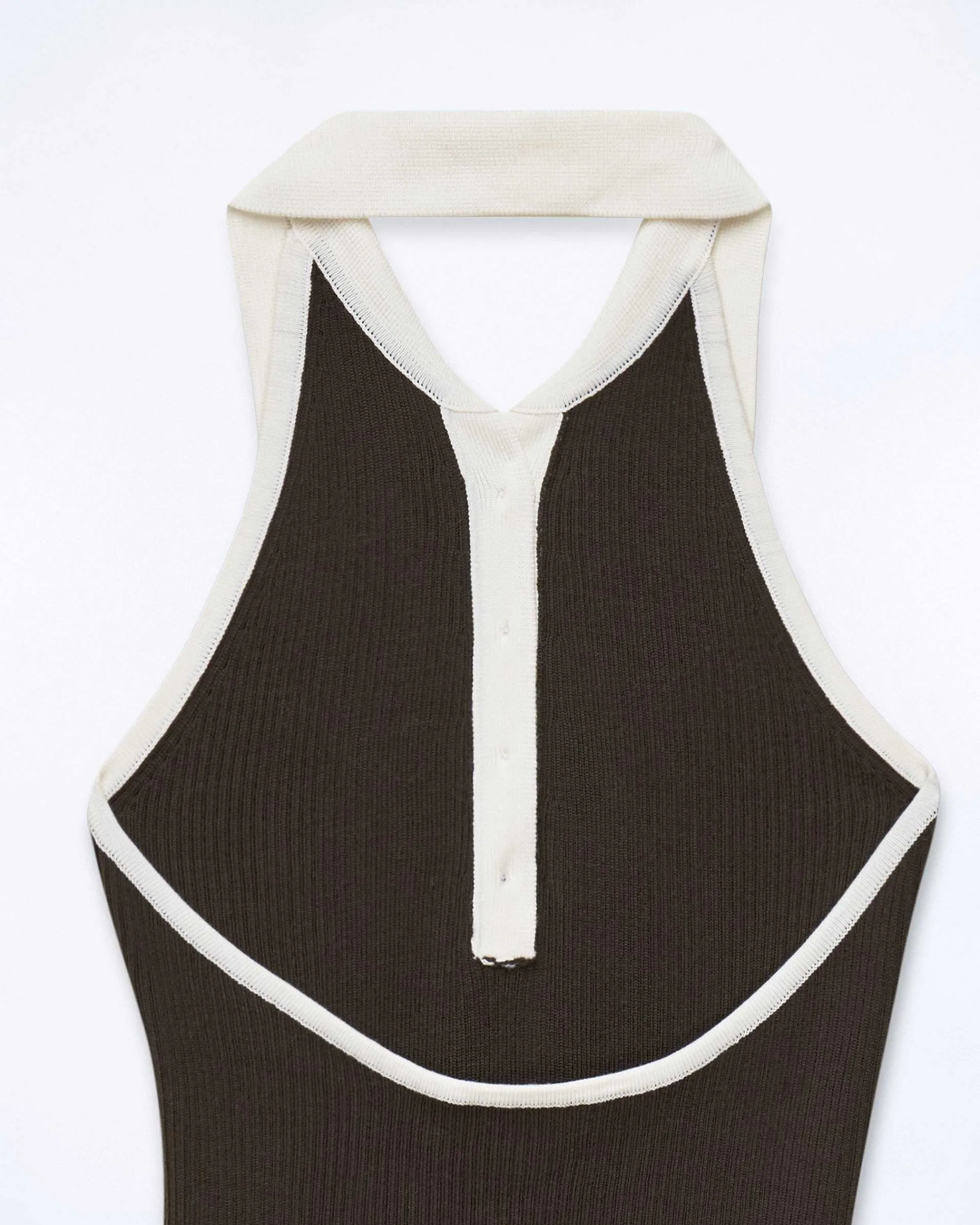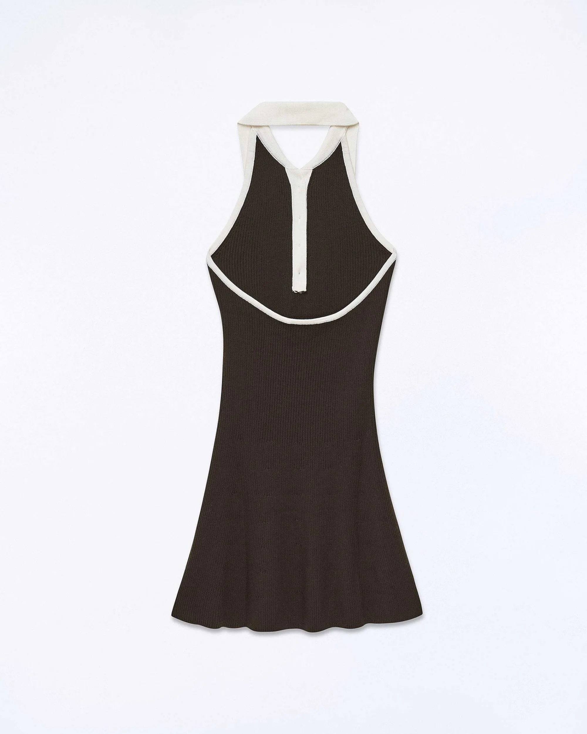 Inspiration Sporty Chic Pour Cette Robe Courte Et Côtelée, Confectionnée En Laine Mérinos. Munie D’Un Col Polo, D’Emmanchures Américaines Et De Bords Contrastés, Elle Séduit Par Son Dos Ouvert Et Son Bas Évasé Pour Un Look Futuriste Audacieux.