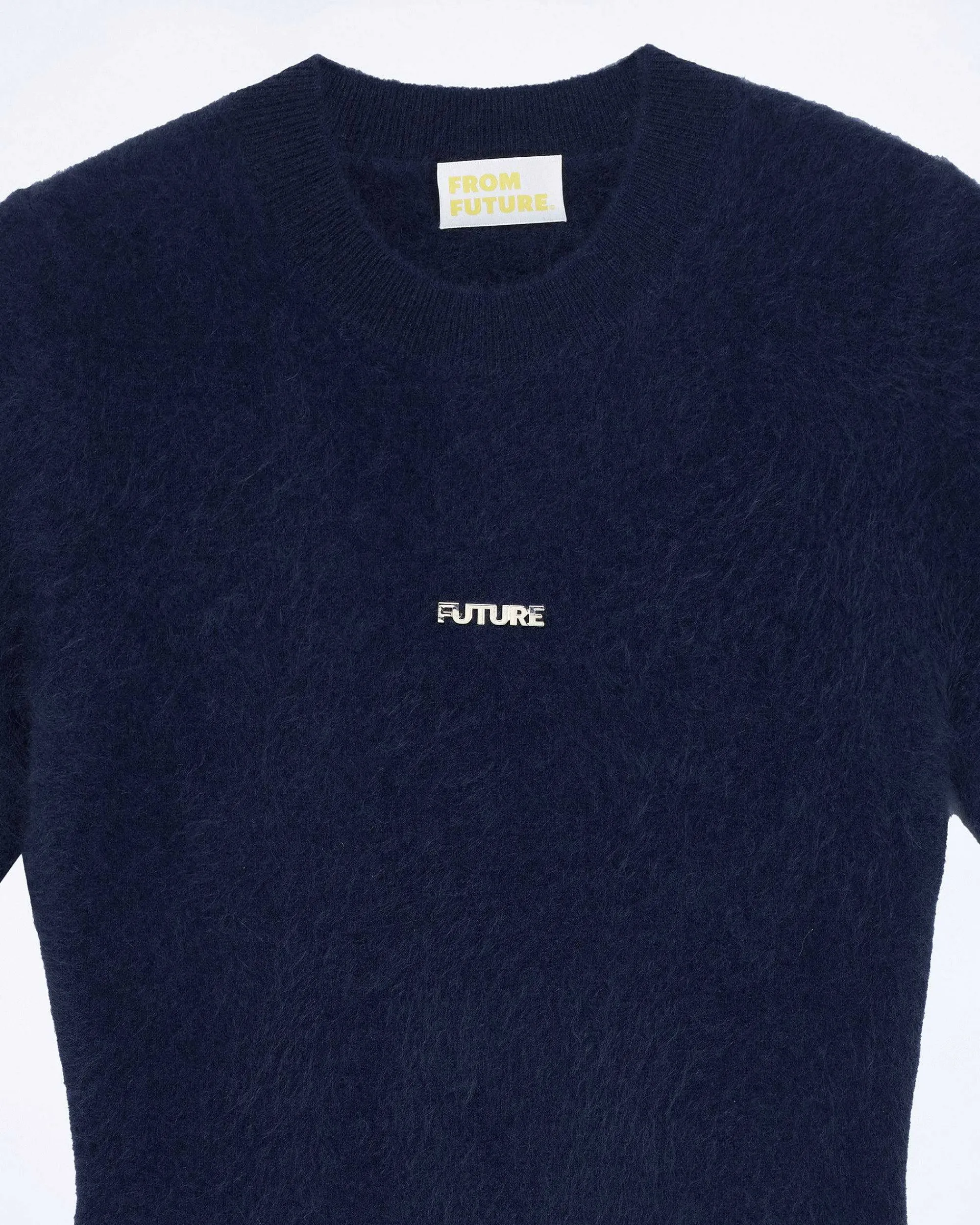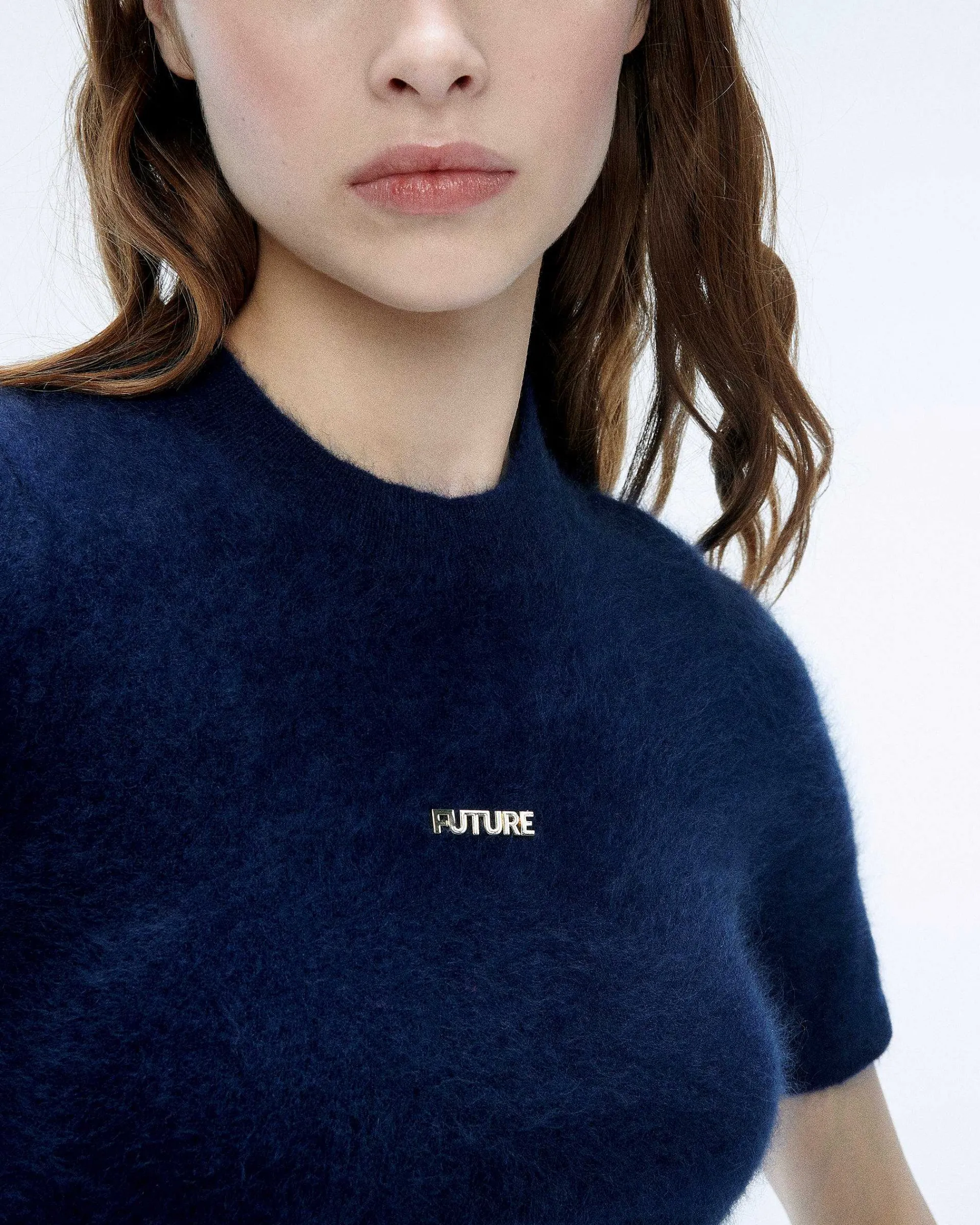 Une Allure Cosmique Dans Cette Robe Courte Et Près Du Corps. Munie D’Un Col Rond Et De Manches Courtes, Elle Est Confectionnée En Cachemire 2 Fils, Et Dévoile Une Plaque Dorée À La Poitrine.